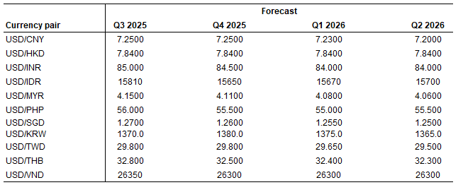 We are negative on currencies such as CNY and VND due to higher US tariffs relative to other Asian countries, currencies which will likely suffer more from sectoral tariffs on electronics and semiconductors such as KRW, and also currency where the central bank could push back harder against currency appreciation such as the likes of TWD and SGD. We think THB will underperform due to domestic factors such as political uncertainty and also continued lack of structural reform momentum.