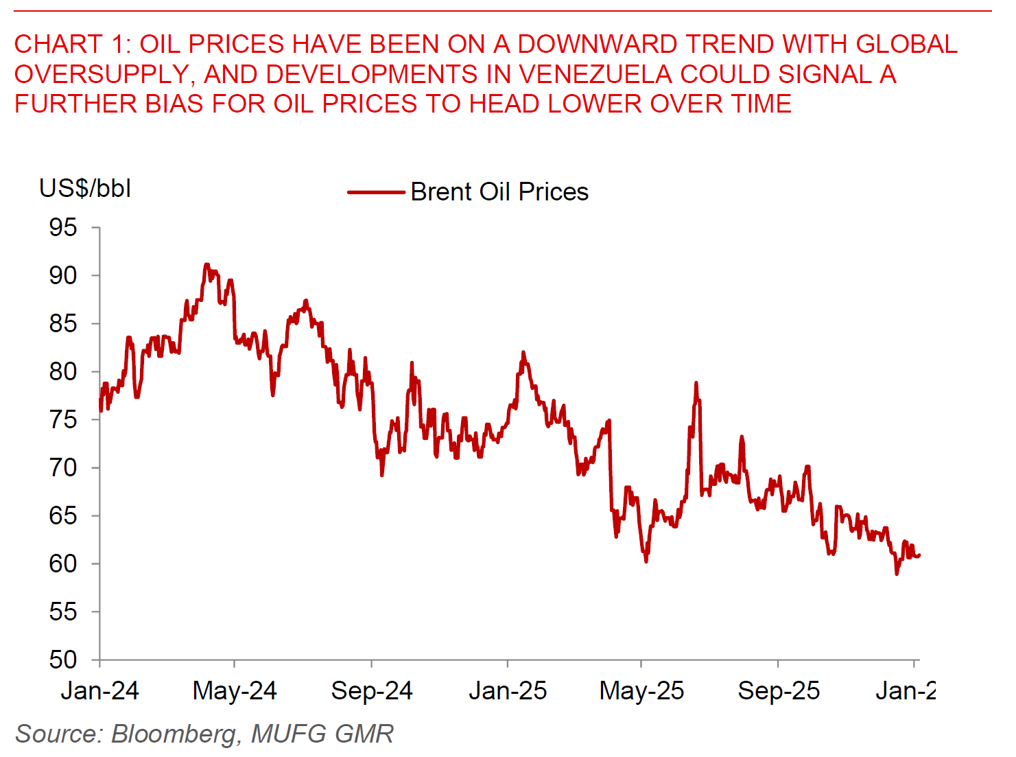 The initial implications for Asia’s markets probably include a bias for oil prices to head lower over time, which could be positive at the margin for larger oil importers in Asia such as KRW, THB, PHP and INR. With oil markets already expected to be in a meaningful surplus in 2026, this could add further pressure for oil prices to head lower, even as there is uncertainty around whether and how quickly Venezuela may be able to ramp up oil production and also regime stability.