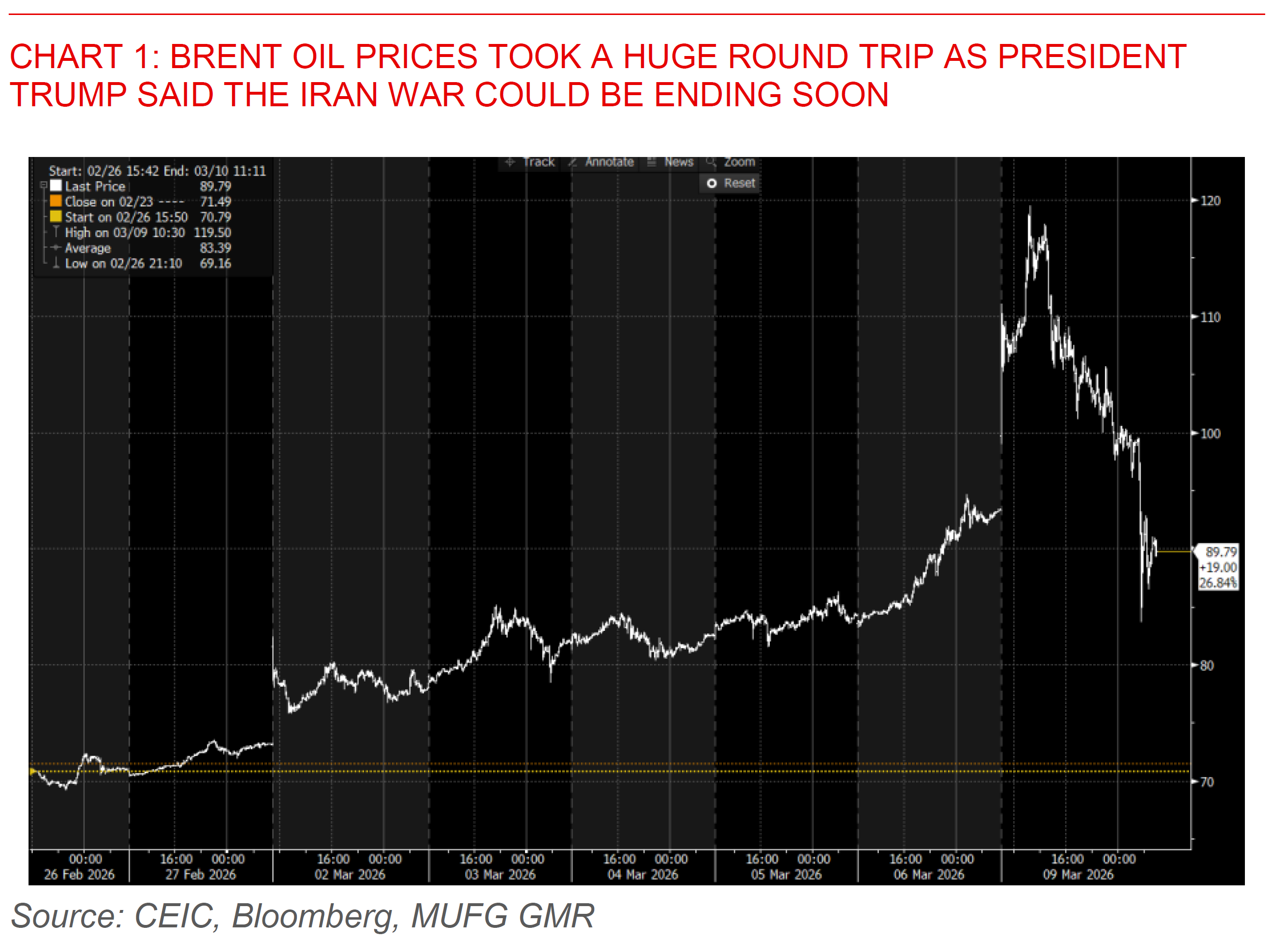 Brent oil prices fluctuated wildly and made a huge roundtrip, rising all the way up to US$120/bbl from US$90/bbl previously, before falling back down closer to earth towards the same level it opened the week. The key driver was comments by President Trump that the Iran war could be ending soon (but not this week), that the operation was ahead of schedule, and that the military objectives could be described as “pretty well complete”. He also coupled these remarks with claims that the US has brought Iran’s missile capability down to 10% and that drone launches from Iran had decreased by 83%. What we do know from the UAE government as well is that drone and missile projectiles detected from Iran has fallen sharply on 9 March to 15 ballistic missiles and 18 drones, from 17 missiles and 117 drones the day before, and the peak of 28 missiles and 332 drones on 1 March. It is unclear whether this drop has been driven by an active choice by Iran, or by necessity due to actual supply and capability constraints from the Iran government.