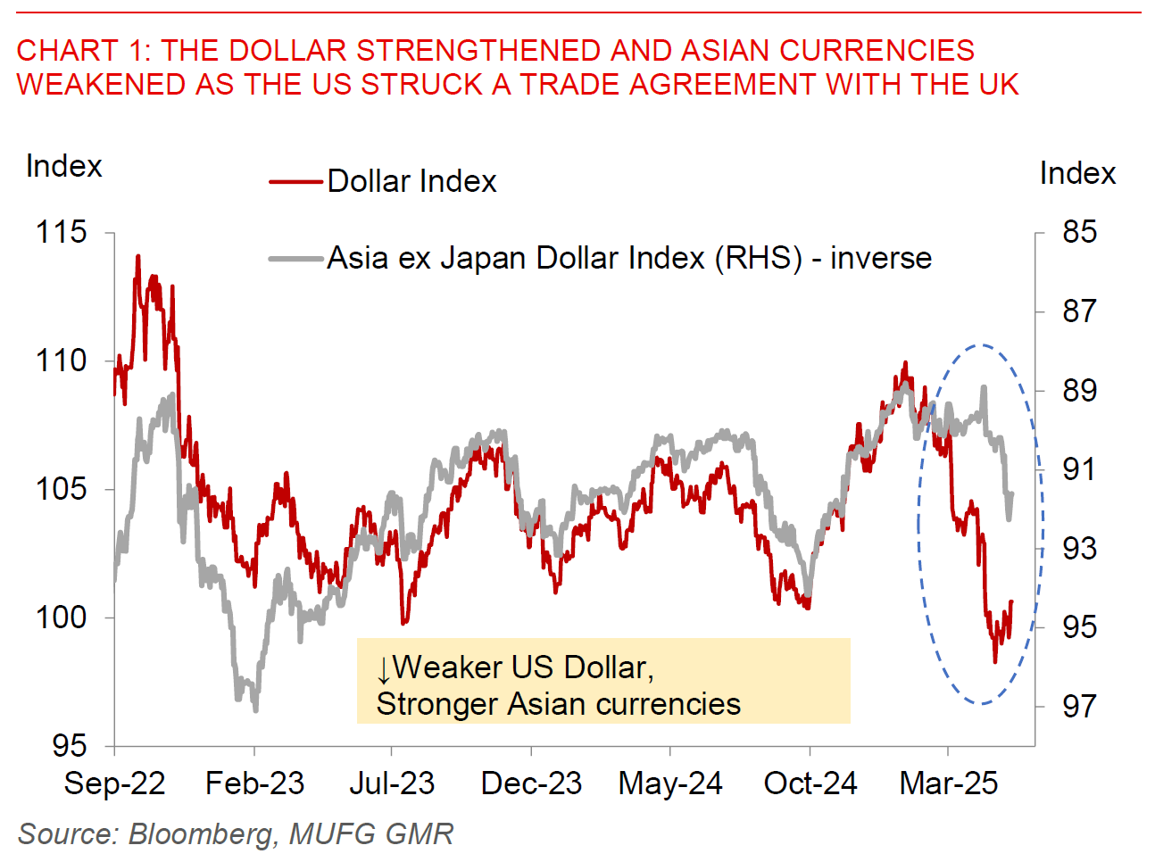 President Trump announced a trade framework with the UK, which may provide clues on the path forward for deals with other countries including here in Asia. First, it seems the 10% base tariffs are mostly here to stay. Trump indicated that many countries (presumably those in Asia as well) will eventually get tariffs higher than 10% due to massive trade surpluses and unfair trade practices, in response to a question.
