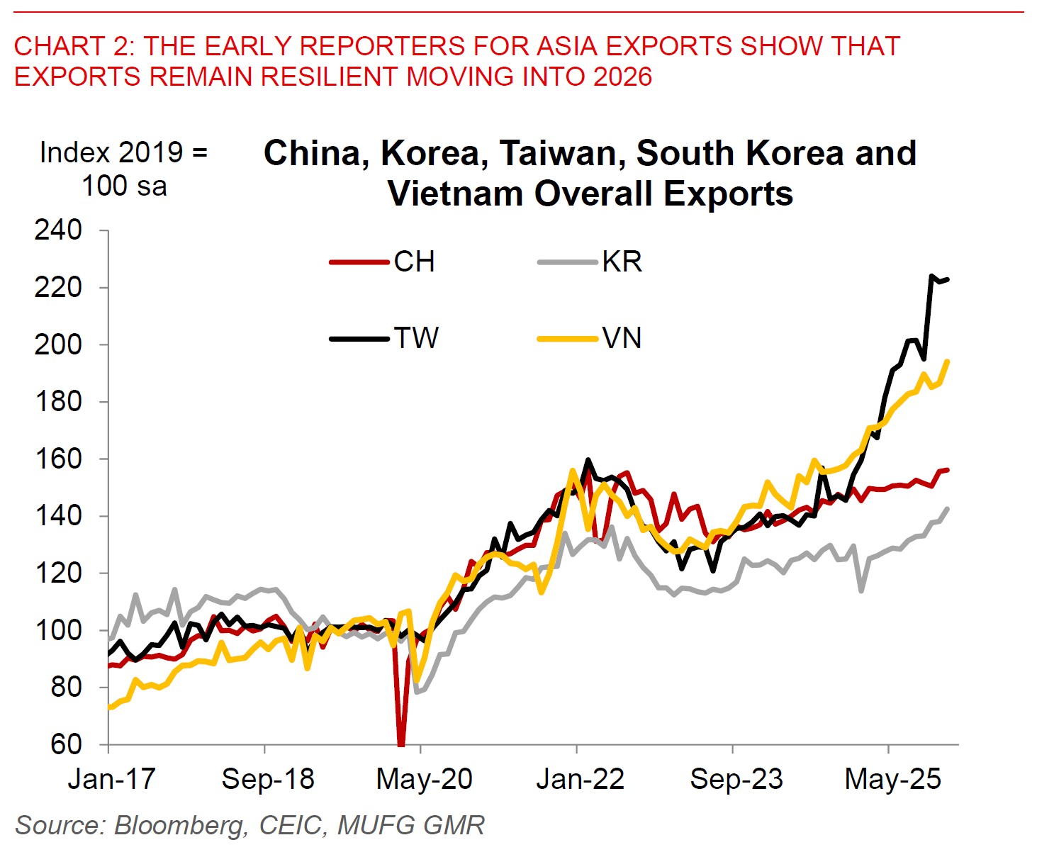 Beyond the China specific story on exports, we think the bigger story from the early reporters for Asia-ex-Japan is that exports remain very robust and resilient for the likes of China, South Korea, Taiwan and Vietnam.