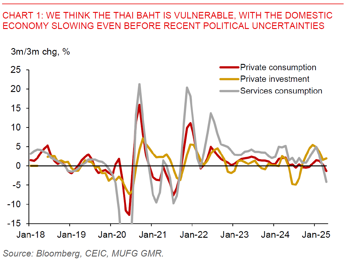 Across Asia, Asian currencies generally followed the weaker Dollar trend, with the Taiwan Dollar remaining very volatile this week. According to a variety of news reports, there could have been reported central bank FX intervention to buy Dollars to prevent Taiwan Dollar strength around the 29.00 levels, with USD/TWD rising to slightly below the 30.00 levels, before strengthening sharply by more than 2% to 29.170 levels as we speak. Meanwhile, Thailand’s Constitutional Court suspended Prime Minister Paetongtarn Shinawatra from office temporarily, until it rules on a petition seeking her permanent removal over alleged ethical misconduct. While the court set no deadline to adjudicate the petition, it gave Paetongtarn 15 days to respond to the allegations, with the deputy prime minister will be the acting leader in the interim. The key transmission mechanism from an economy perspective will come from a delay in passage of the budget, which could lead to lower fiscal support and hence slow growth moving forward, and also coming at the time of significant uncertainty around possible tariffs from the US. A left tail risk would be a fall of the current Thai government and dissolution of parliament leading to fresh elections, perhaps also catalysed by more meaningful protests. While this is not our base case, we continue to think Thai Baht will underperform moving forward (see Thai baht vulnerable as growth slows and multiple risks loom).