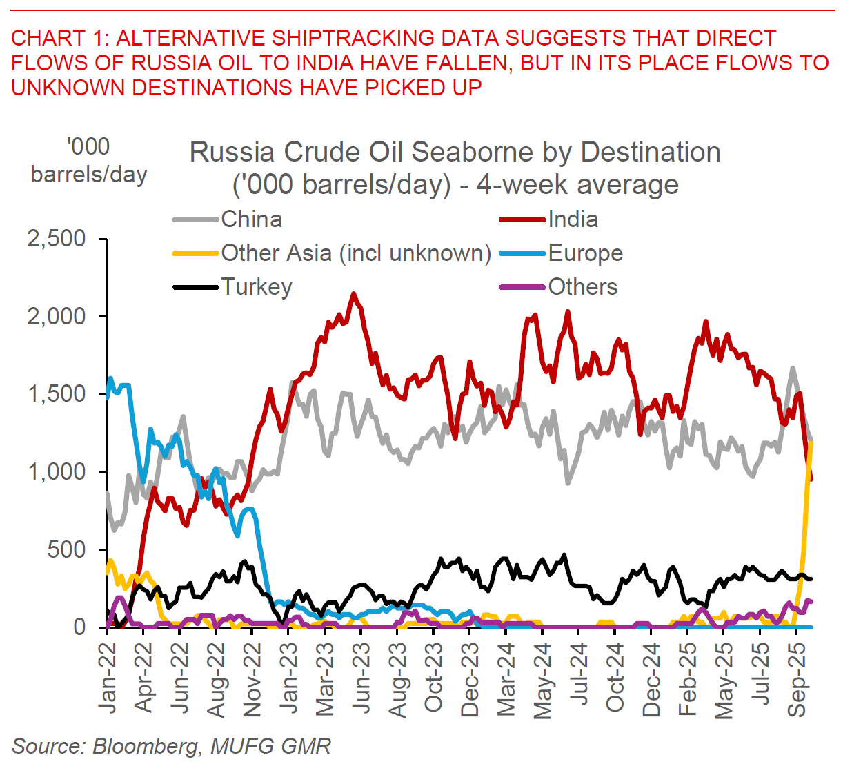 From a macro perspective, our best sense is that the oil market is still very much oversupplied to begin with, with global inventories still high and rising with meaningful spare capacity in Saudi Arabia. In addition, while direct flows of Russia oil may come down, historically the markets have also shown that indirect and clandestine flows could pickup as well. As an example, alternative shiptracking data shows that India could have been reducing purchases of oil directly from Russia, but the flows to “unknown destinations” and “other Asia” have also surged correspondingly. As such the net impact to the oil market could be far less what news headlines suggest, although it is no doubt a key risk to monitor moving forward.