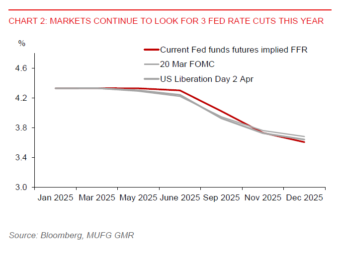 Near-term inflation expectations have moved up, with surveys suggesting that tariffs are driving this increase. Powell said the Fed is obligated to keep inflation expectations anchored, and that current policy stance is appropriate and modestly restrictive. For now, tariff impact has yet to show up in the hard economic data, though. Powell said that the US economy still looks solid, despite the negative Q1 GDP print. We note that the 0.3%qoq annualized drop in Q1 US GDP growth was primarily due to an import surge as firms sought to front-run tariffs. The front-running of tariffs appears to be fading, which should reduce a drag on the US economy in Q2. Meanwhile, Powell said that labour market dynamics are broadly balanced and no longer a source of significant inflation. The somewhat hawkish tone by the Fed has supported a rebound in the US dollar, but it has not changed the pre-FOMC market expectation of 3 US rate cuts this year (Chart 2).