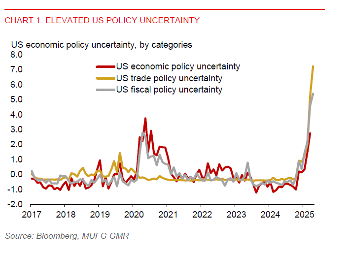 The Fed unanimously held the benchmark policy rate at 4.25%-4.50% as widely expected, defying pressure from US President Trump for a lower policy rate. Fed Chair Powell said that Trump’s comments don’t impact their jobs. The Fed is also in no hurry to adjust rates and that the costs of waiting for more clarity about the impact of Trump’s tariff policy are fairly low. Uncertainty about the US economic outlook has risen and stayed elevated (Chart 1). This is not a backdrop where the Fed can act preemptively. But Powell said the Fed can react quickly if needed. Meanwhile, policymakers have flagged an increased risk of higher unemployment and higher inflation. There will be policy trade-offs if both unemployment and inflation rise, putting the Fed in a difficult predicament.