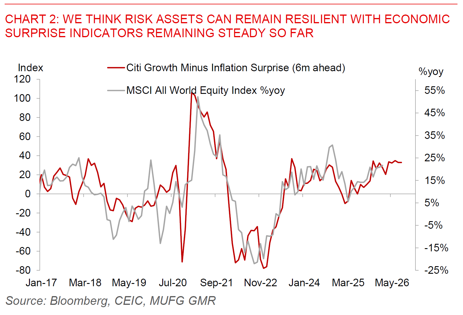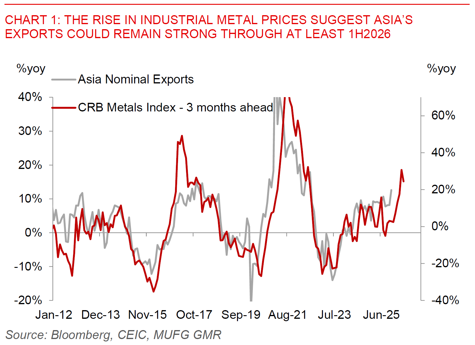 Notwithstanding these risks above, we continue to think that strong risk sentiment can continue through 2026, especially towards assets which are undervalued outside of the US. What gives us some comfort for our region is the fact that industrial metal prices continue to rise, with copper in particular surging by as much as 11% to trade above US$14,500 a ton for the first time ever. Our analysis shows that industrial metals are one of the best leading indicators of Asia’s exports, and the trend thus far suggests that Asia’s exports could if anything accelerate through 1H2026 despite all the global uncertainties. If we combine all these with still steady global economic and inflation surprise indices, coupled with the surge in spot DRAM prices, we think the export outlook and risk sentiment outlook for Asia remains quite bright.
