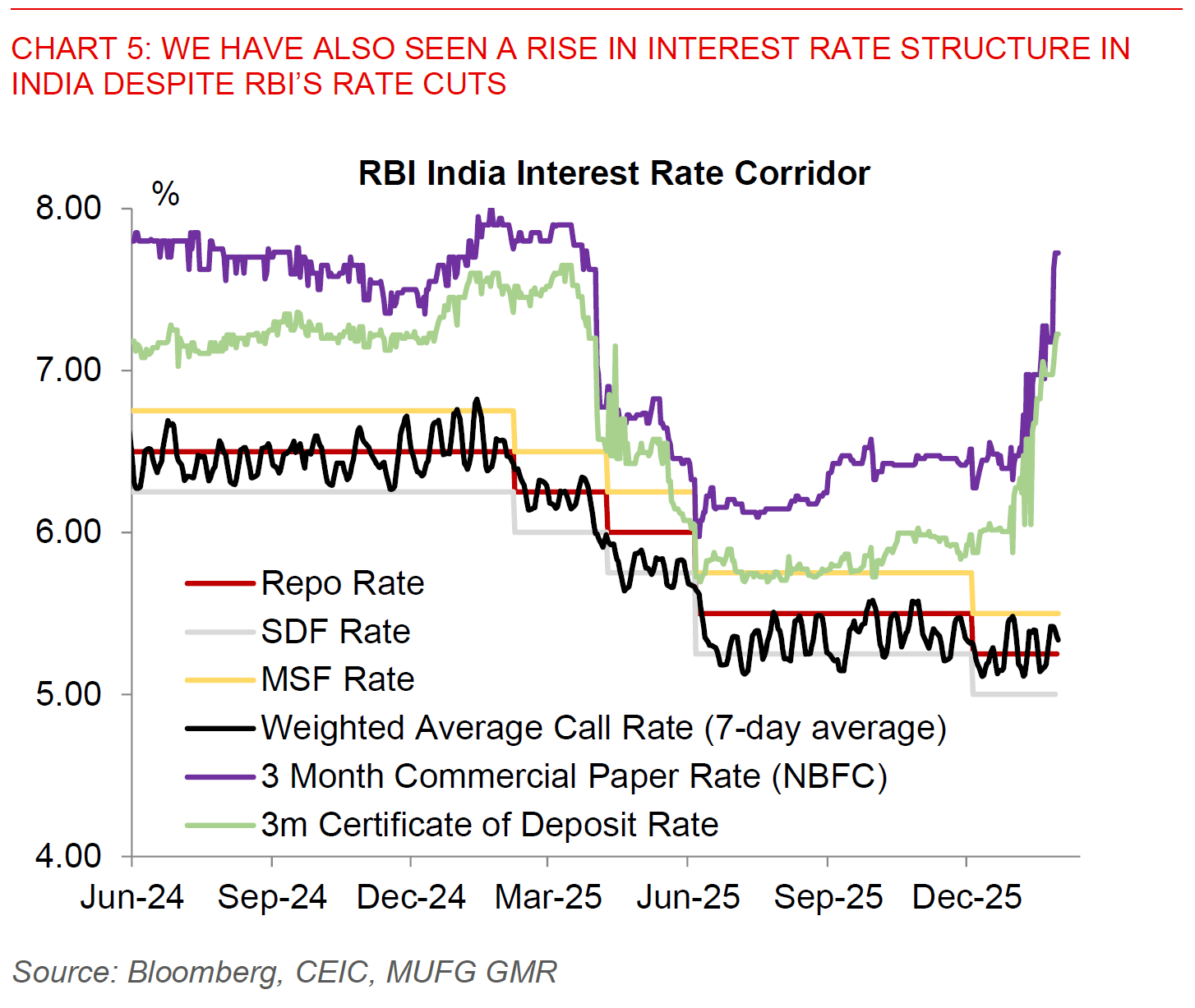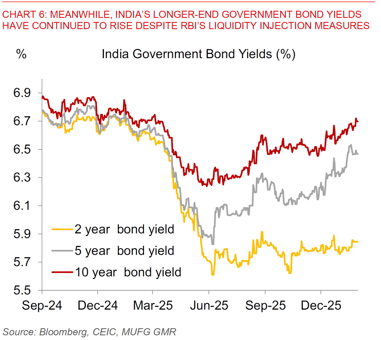 On that front, India’s FY2026/27 Budget to be announced on 1 Feb Sunday will be more important than usual from an INR FX and rates perspective. Markets will watch closely for whether the central government in India commits to a credible fiscal consolidation path, and this is coming in the broader context of rising debt borrowing requirements from state governments with increasing cash transfer programs at the state level. In addition, an environment of weak capital inflows and with that continued RBI FX intervention has resulted in a general rise in interest rate structure, with fiscal concerns also pushing up government bond yields on the longer-end despite RBI rate cuts and also continued INR liquidity injections (see India – Flows before growth – this time is different for INR).