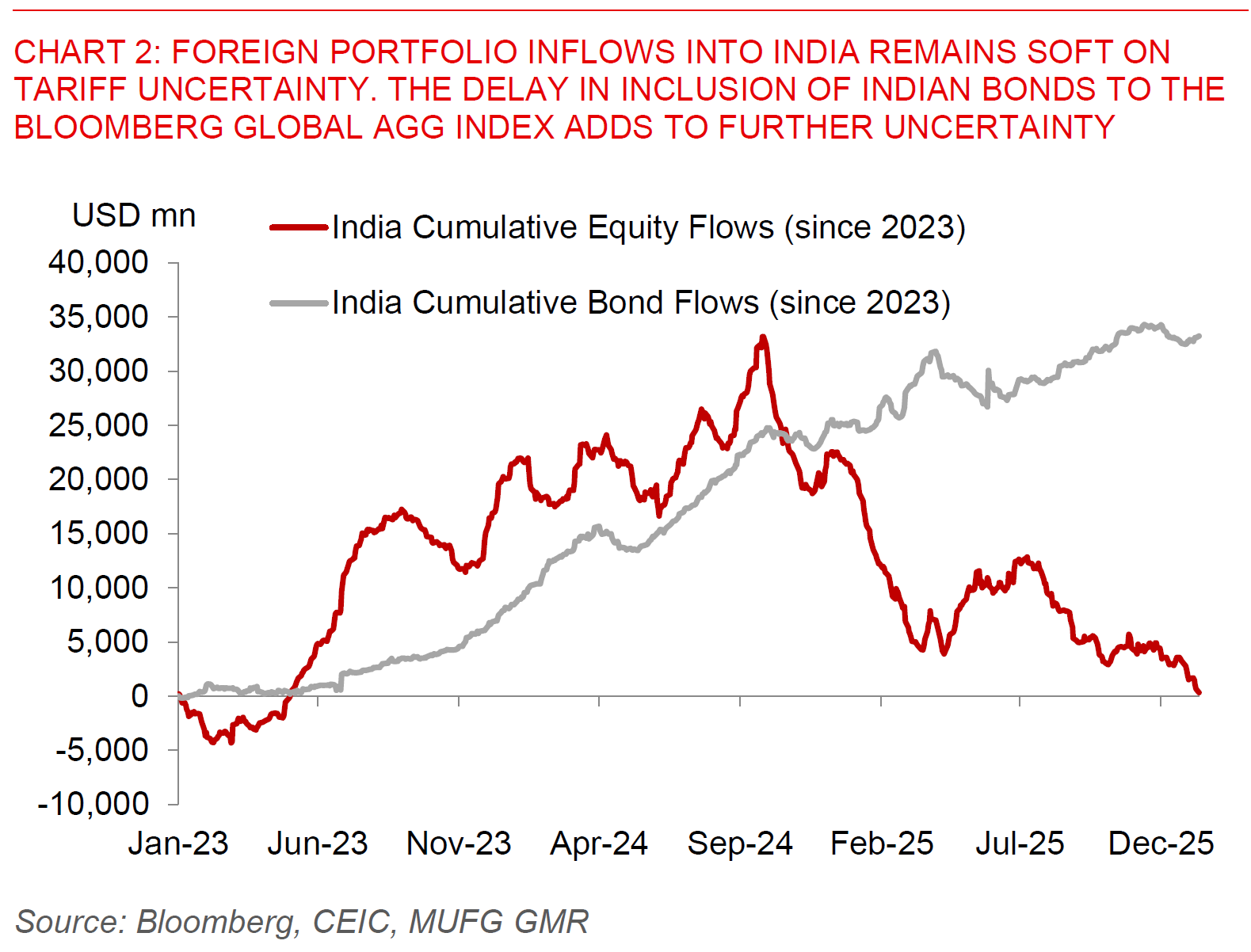 From an FX perspective for INR, inclusion of Indian bonds into the Bloomberg Global Agg could have brought anywhere between US$15-20bn of flows over time, assuming a ultimate weight of 0.75-1%. This would have been important given the drying up of capital inflows, tariff uncertainty and as such, continued pressure for INR to weaken. The next catalyst for INR will likely be the upcoming Union Budget 2026 scheduled for 1 Feb and markets will be watching the extent of commitment towards fiscal consolidation and what that implies for macro stability. We forecast USD/INR rising towards the 92.00 handle, underperforming key G10 and Asia FX pairs.