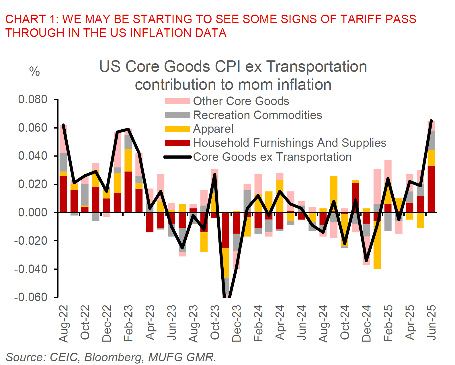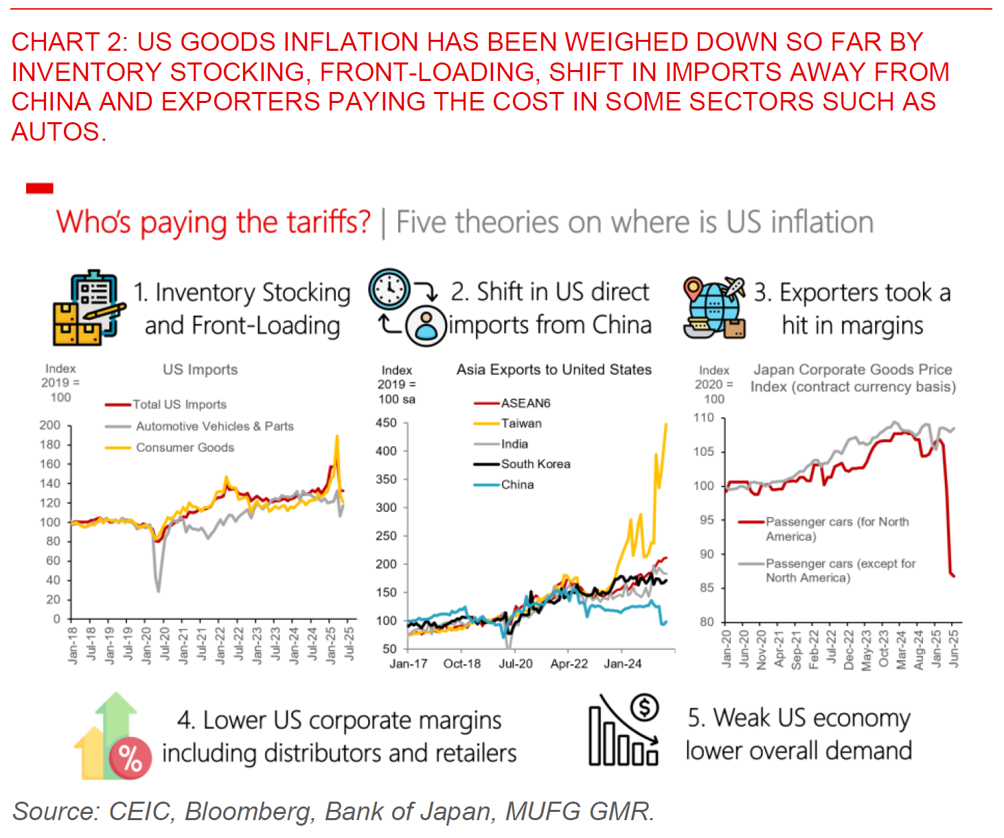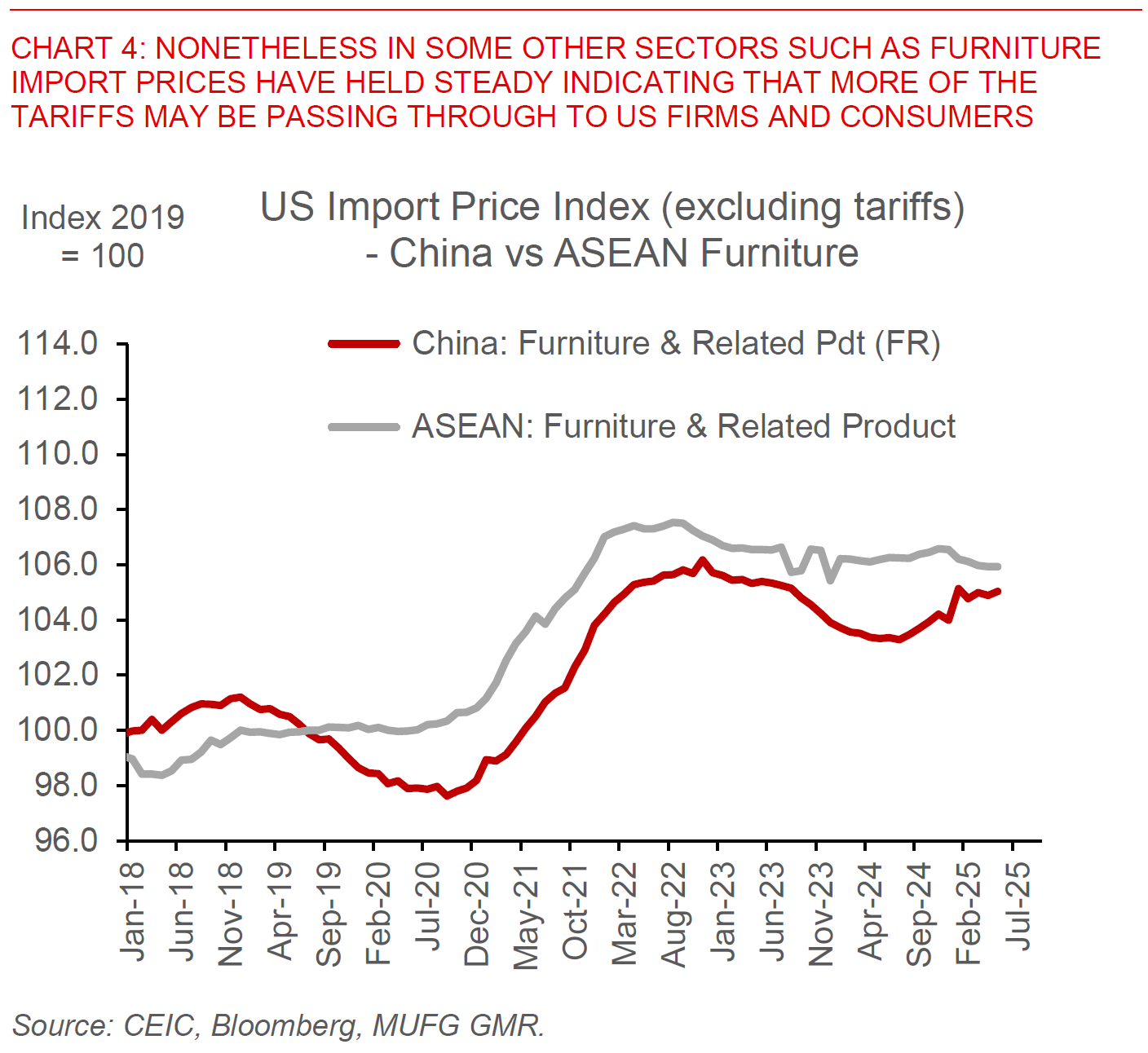 These US inflation developments are to some extent corroborated by other datapoints, showing that at least so far part of the cost of tariffs may have been shared along the way by other players. The sharp fall in Japan passenger car export prices fits well with the data showing continued softness in auto CPI inflation, while import front-loading, inventory stocking and a shift in the composition of US imports away from China to the rest of Asia could also have softened the effective tariff rate paid by US corporates and ultimately US consumers. US import price data shows a mixed picture across products, with some sharp cuts in apparel import prices from China exhibiting perhaps some cost sharing with US importers, but with steady prices in other manufacturing items such as furniture and household goods, and fits well with the general picture that we see in the June CPI inflation showing some passthrough where perhaps substitutes are scarce and pricing power is stronger in the sector. As such, the extent of inflation pass-through moving forward will also depend on whether these offsets including soft US demand and services inflation dominate.