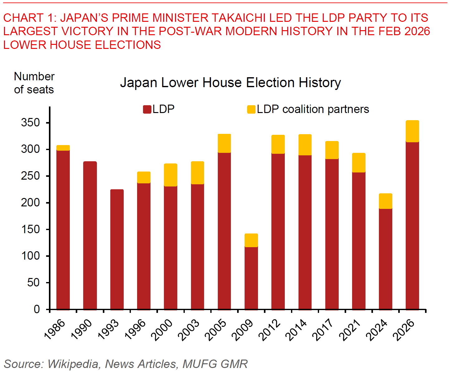 Japan’s Prime Minister Takaichi led the LDP party to its largest victory in its post-war modern history in the February 2026 Lower House Elections. The LDP won a resounding 316 seats out of 465 in total, and surpassing the 300 seats last won by LDP under Prime Minister Nakasone in 1986. In addition, the LDP together with its coalition partner Ishin no Kai now have 352 seats in the Lower House, well surpassing even the two-thirds supermajority threshold.