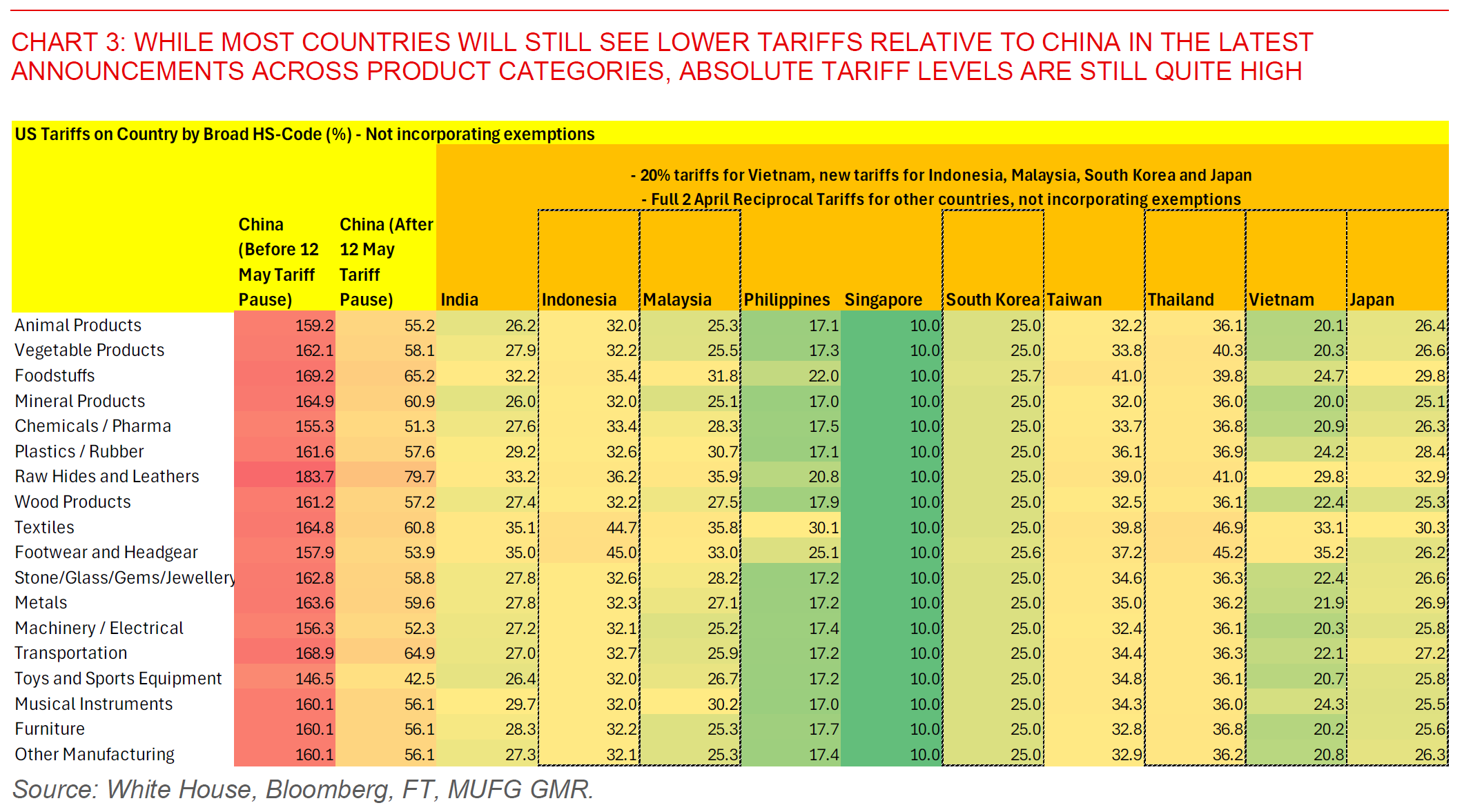 Moving forward, there are three key questions to gauge the macro and market impact. First, how much room is there really for negotiations in reality ahead of the August deadline. While Trump said that the tariff rates are not 100% firm, it is unclear what else smaller Asian countries can offer the US beyond what has already been discussed over the past 3 months. South Korea meanwhile mentioned that it will fix non-tariff barriers including rules and regulations, and so this could perhaps be one avenue for negotiations. Second, the likes of India, Philippines and Singapore may have a higher chance of seeing a trade deal given that their rates have not been announced yet, even as we acknowledge it may just be a matter of administrative capacity in pushing out the letters. Third, all the letters highlighted imposing higher tariff rates on “transshipment” goods, but as with the US-Vietnam agreement how that is defined and enforced and is still massively unclear. We personally suspect that the US will define transshipment as a certain threshold of foreign content but to do so would also require tracking of which country the foreign content comes from and is clearly a rewriting of the existing rules of origin for global trade.