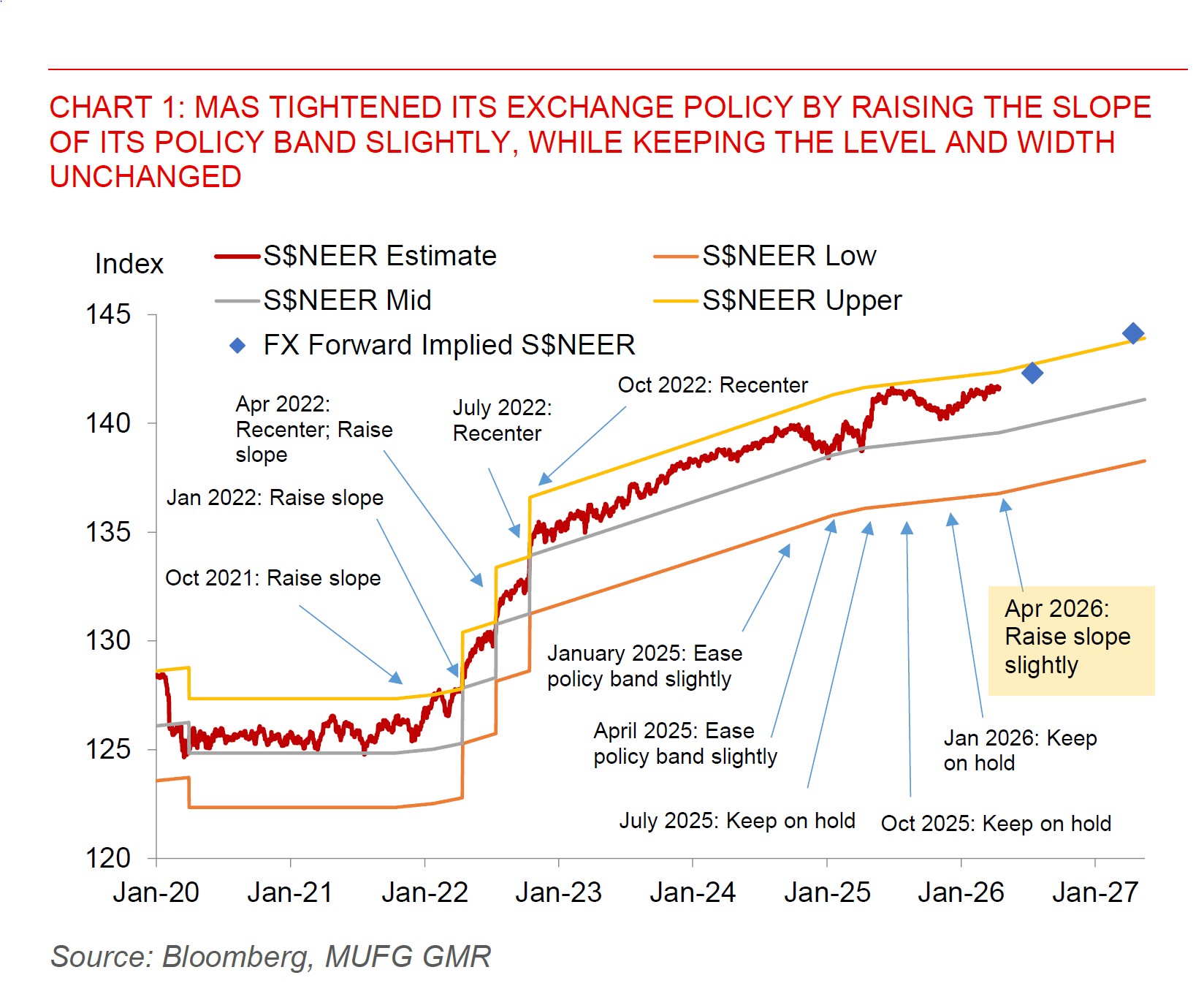 In the immediate aftermath of the policy meeting, we saw a knee-jerk reaction higher in USD/SGD, with S$NEER also moving as such, to around 0.5-0.6% below the upper bound of the exchange rate band by our estimates. This may partly reflect the pricing and expectations of markets currently for tightening, as proxied by FX forward markets. With the current slope of S$NEER policy around 1% in April 2026 from 0.5% previously, FX forwards already seem to imply and price for S$NEER griding higher at current settings over the next 12 months. The next move as such is likely to depend on any upside or downside surprises to MAS’ inflation and output gap assessments.