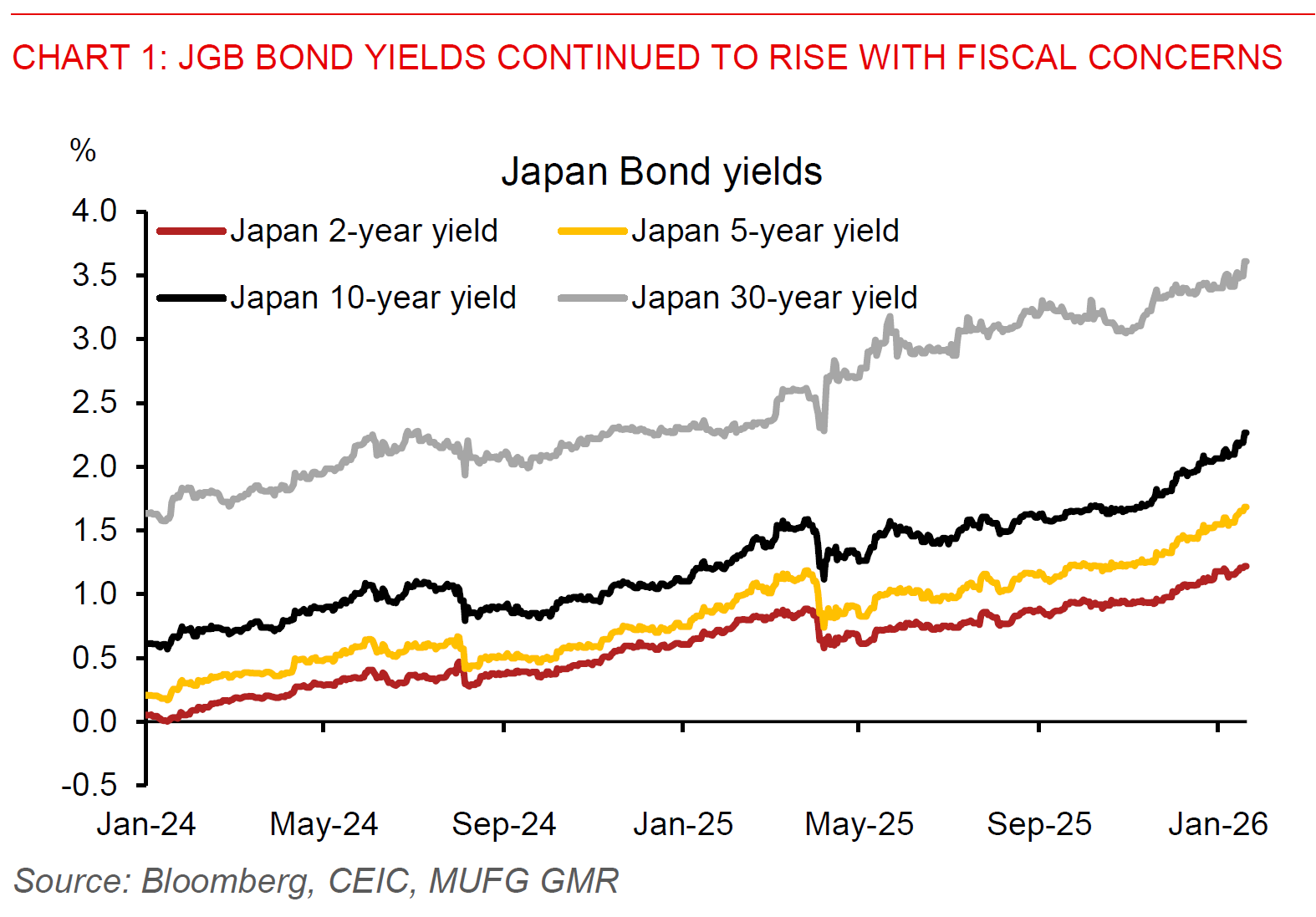 JGB bond yields rose sharply, while USD/JPY moved up above the 158 level with some FX underperformance, as markets digested the implications of the upcoming 8 Feb snap Lower House elections. Meanwhile, Asian currencies continued to show divergence, with outperformance in the Chinese renminbi contrasting with underperformance in the high-yielders such as IDR, INR, PHP, driven partly by fiscal concerns in these countries.
