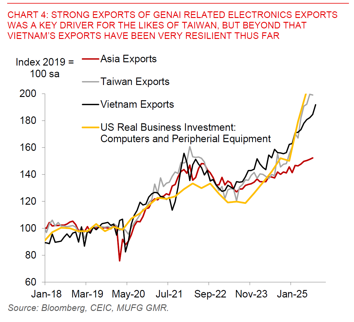 Last but not least, Vietnam released its export and trade indicators for September, providing one of the first read across Asia for export activity and the impact from tariffs. The numbers were impressive, with a 25%yoy rise in exports, and driven by more than 30% rise in trade and exports to the US. Of course, once again the full impact of tariffs may not have been felt yet, with some goods on water likely still exempt from tariffs at least till October, while some key products such as electronics still receiving exemptions for now. The data suggests as such, with a 66%yoy surge in electronic exports, but outside of that the export numbers were probably more resilient than a 20% tariff would suggest, with a 47%yoy rise in textile fibres, 9% rise in textiles and footwear, 12%yoy rise in machinery equipment and 13%yoy rise in furniture.