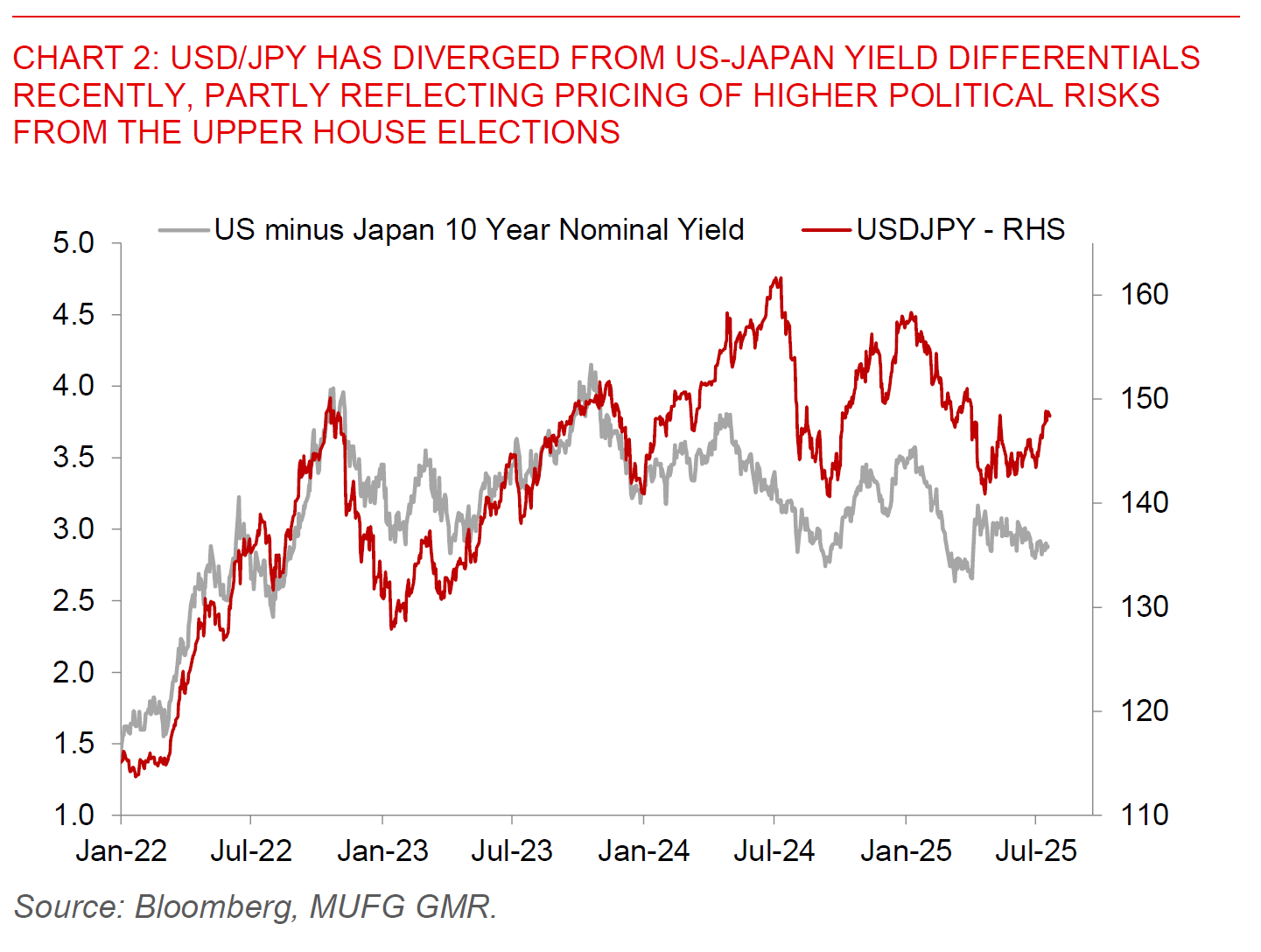 In Japan’s Upper House Elections, the ruling Liberal Democratic Party along with partner New Komeito lost its majority in the chamber, according to public broadcaster NHK. This marks the first since 1955 that the LDP-led government has fallen below a majority in both the lower and upper house, potentially increasing political instability in Japan. The latest seat count by NHK had LDP and Komeito combining for 47 seats in this election (LDP: 39 and Komeito: 8). If upheld, this seems to have fallen short of perhaps more disastrous scenarios indicated in Initial exit polls (32-51 seats), but is overall likely a repudiation still for Prime Minister Ishiba.