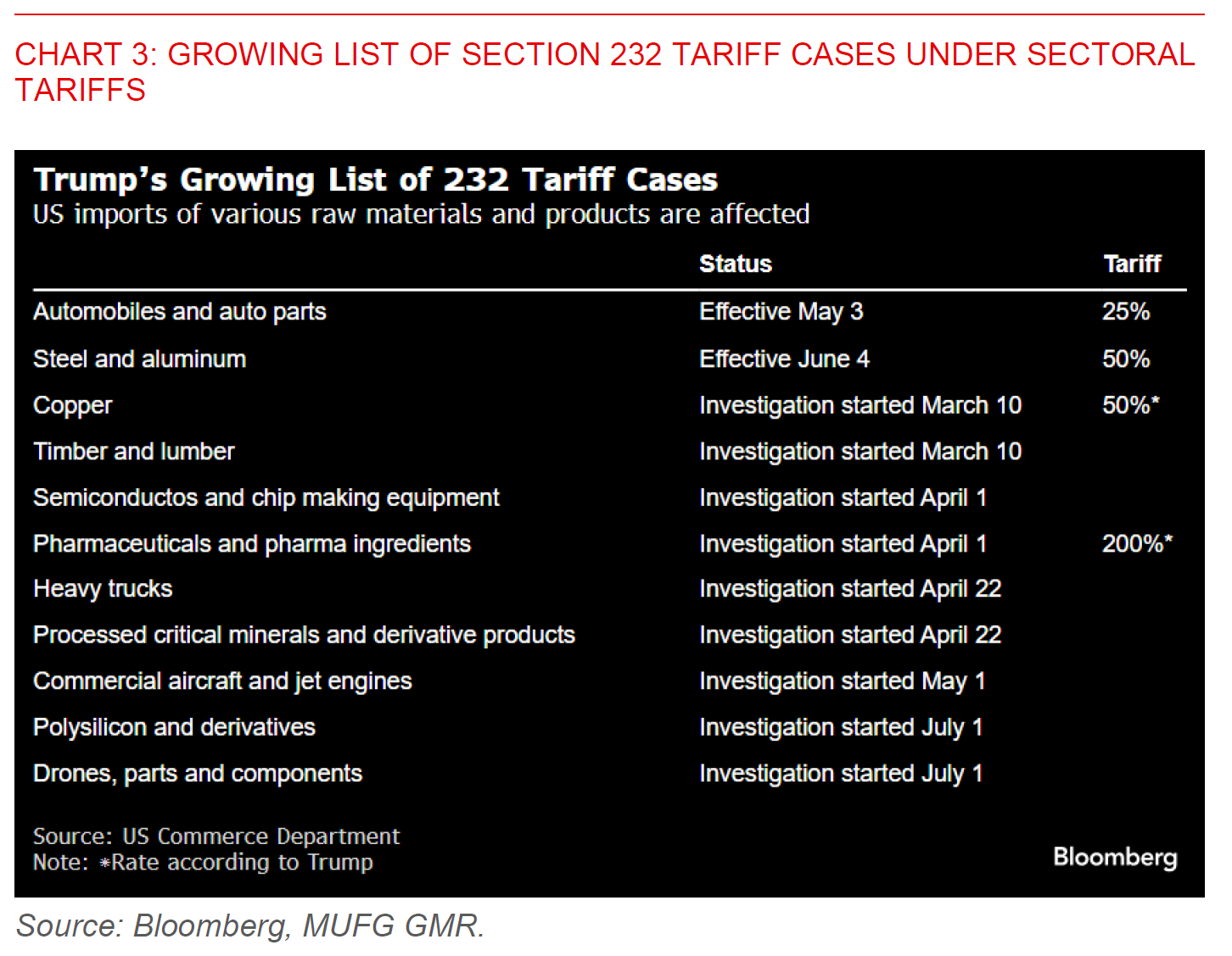 Beyond the Japan Upper House Elections, Bloomberg News reported that President Trump is readying plans for industry-specific tariffs to kick in alongside his country-by-country duties in two weeks. Details of Trump’s planned 50% duty on copper could be released before 1 Aug, tariffs on pharmaceuticals could be imposed by month’s end, while import taxes on semiconductors could come soon as well. Overall, the sectoral tariffs could cover 30% to 70% of a country’s exports under these Section 232 investigations, with the rest being hit by country specific reciprocal tariffs.