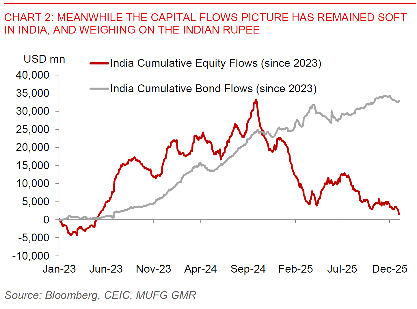 Dispersion driven by local factors will become more important for Asia FX and rates markets in 2026. For instance, with capital flows remaining soft into India given still high relative valuations in equity markets coupled with a strong IPO exit pipeline, we think that INR can continue to underperform moving forward (see INR Balance of payments remains unbalanced). For the likes of Vietnam, while exports are strong, the more important story is a possible overheating of the economy with the strong 8%yoy 4Q2025 GDP growth indicative of that possibility. While we remain positive on Vietnam’s macro outlook given the structural reform momentum, from a FX perspective we remain biased to see USD/VND rise over time to 26,800 through 2026 and for the SBV to hike rates later this year – the only Asian central bank to do so (see Vietnam – Modest risk of overheating amidst very positive structural reforms). Meanwhile, domestic policy uncertainty in Indonesia should imply IDR remains on the backfoot through 2026, with the soft import data out indicative of a still weak outlook for domestic demand (Indonesia – BI finds itself in a delicate balancing act).