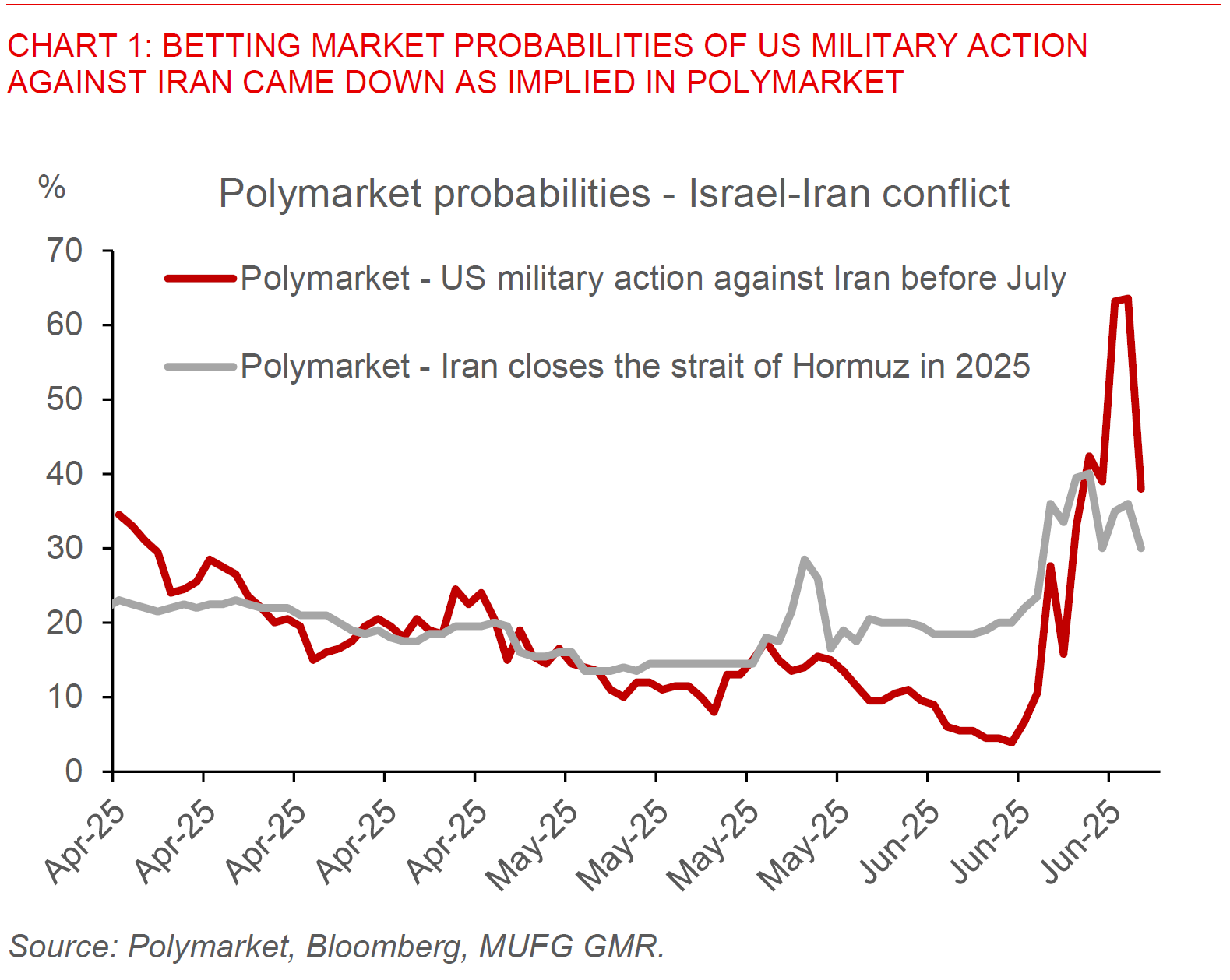 Overnight oil prices and the Dollar sold off slightly, as US President Trump said that there could be new talks with Iran in the “near future”, and that he would decide whether to join Israel’s attacks on the country “within the next two weeks”. For what it’s worth, post the White House statement by the US President, betting market probabilities as implied by Polymarket on US military action on Iran before July fell from a high of 64% down to 38% at the time of writing. Our previous framework to gauge the market impact on Israel-Iran conflict still holds true: first, whether there are actual physical disruptions to global oil supplies including out of Iran. Second, whether the Strait of Hormuz is disrupted – a key chokepoint where a third of all seaborn oil and gas supplies go through. Lastly, the possible involvement of the US on the conflict. On the first 2 points, the good news is that there has not been so far any signs of physical disruptions in oil markets and the Strait of Hormuz, although we note that the possible involvement of the US is a key uncertainty moving forward.