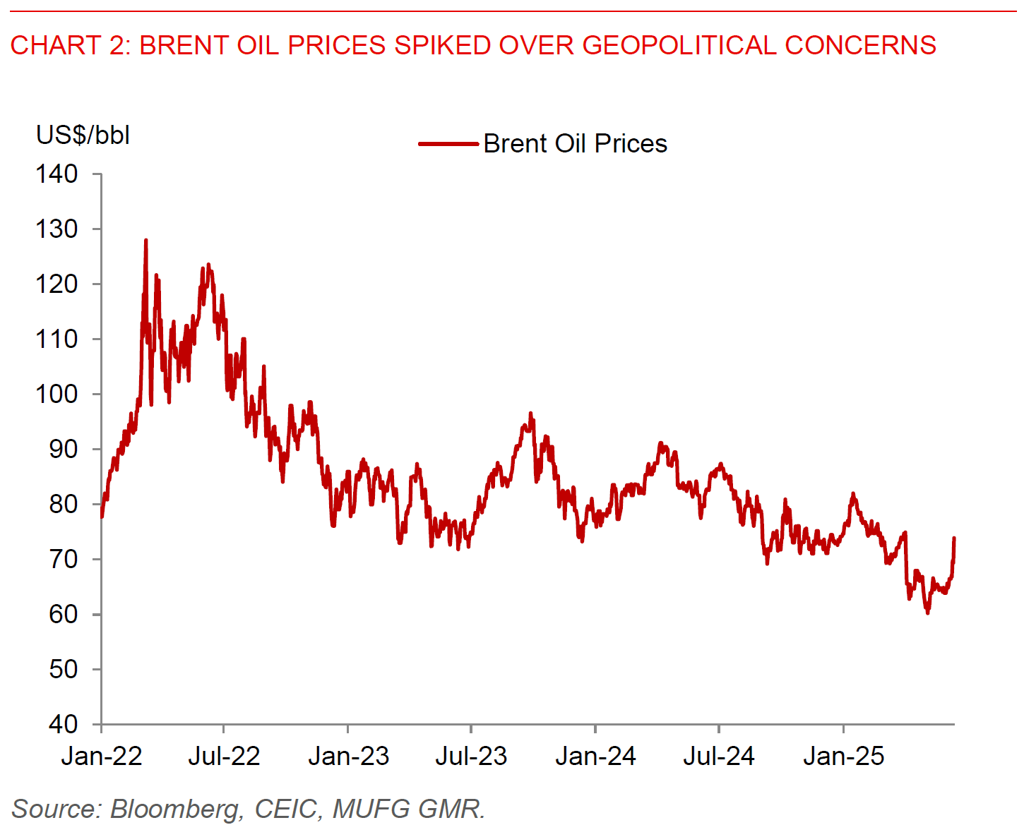 On that front, one key risk to watch for on inflation not just in US but also in Asia is on oil prices, with Israel reportedly launching airstrikes on Iran, in a major escalation in the standoff over Iran’s atomic program. Oil prices surged by more than 5% post the report, jumping above US$73/bbl. We have already seen some reversal in risk-sensitive assets such as the Korean Won this morning, together with a rally in alternative safe havens such as gold, JPY and CHF. The spike in oil prices may also weigh on currencies which depend on oil imports such as INR and PHP, but with the starting level of inflation and current account deficits quite decent, it could take a sustained spike in oil prices to meaningfully change the trajectory of Asia FX.