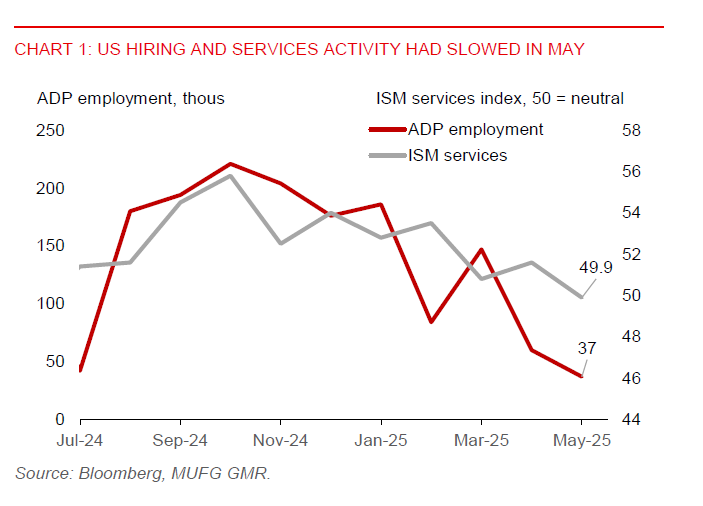 The US ADP employment report showed a gain of 37,000 private-sector jobs in May, missing market expectations of 114,000. The softer-than-expected print followed a downward revision to April’s ADP employment to 60,000, from 62,000 previously. It could also presage a notable slowdown in Friday’s nonfarm payrolls. This suggests that hiring momentum is easing amid heightened economic policy uncertainty. In response, President Trump is again putting pressure on Fed Chair Powell to lower the policy rate.