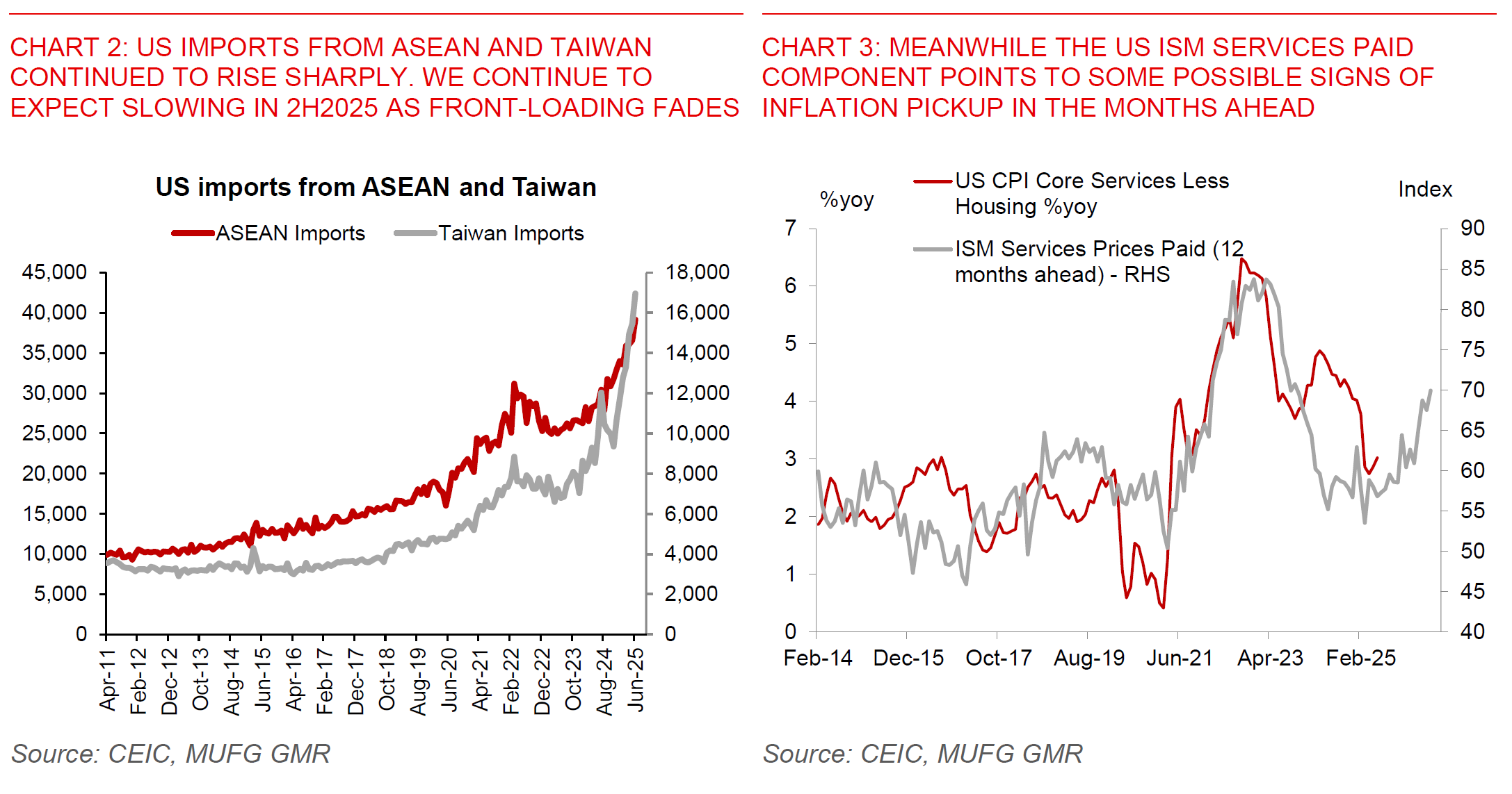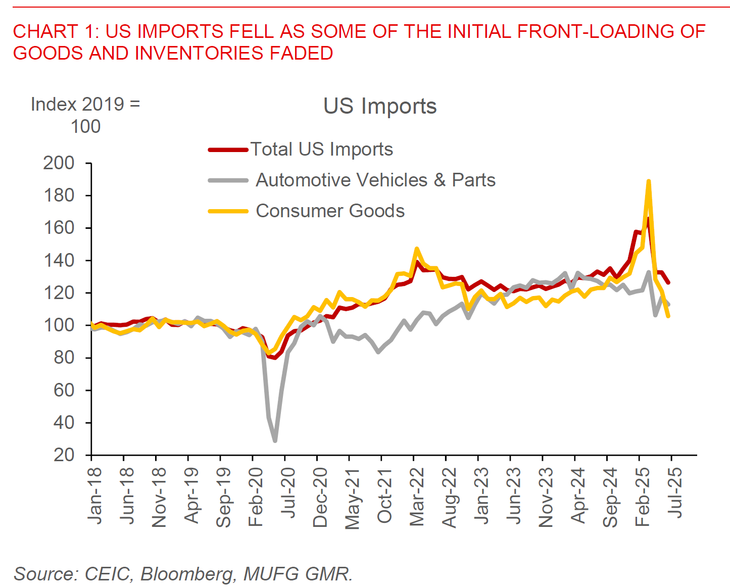 The combination of the macro data from US points to an economy that is slowing somewhat and also initial signs that inflation will continue to pass-through to end-consumers once we move past the initial period tariff announcements. In particular the July ISM Services index moderated to 50.1 from 50.8, with weaker new orders and employment, together with a further increase in the prices paid sub-component. Meanwhile, US goods imports fell by more than 4% in June, led by softer consumer and automotive imports, although capital goods imports picked up during the month. The country divergence was also interesting, with further declines in US imports from the Euro Area – likely reflecting softer pharma and auto imports – but with still very sharp imports increase for several Asian markets including Vietnam, Indonesia, Taiwan and Thailand. All these corroborate the trends we have seen out of Asia’s export, but more importantly also points to the likely unsustainability of the front-loading that is currently taking place. We as such continue to expect some slowdown in Asia’s exports to the US in 2H2025 as inventories start to get drawn down, and from US inflation perspective we expect greater price passthrough in the months to come.