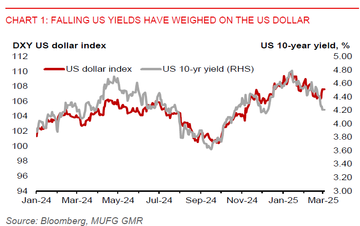 Markets appear to have become more concerned about a potential slowdown in the US economy. The fed funds futures market has priced in 68bps of US rate cuts in the rest of this year, or nearly 3 cuts. US 2-year treasury yield has also dropped below 4.00%, not seen since November 2024. However, US 10-year yield has fallen more than the 2-year yield since US President Trump’s inauguration on 20 January. And if DOGE is successful in significantly cutting the US budget deficits, US long-term yields could fall further. However, the US dollar has recently been supported by President Trump’s renewed tariff threat, with the 25% tariff on Canada and Mexico set to come into effect on 4 March.