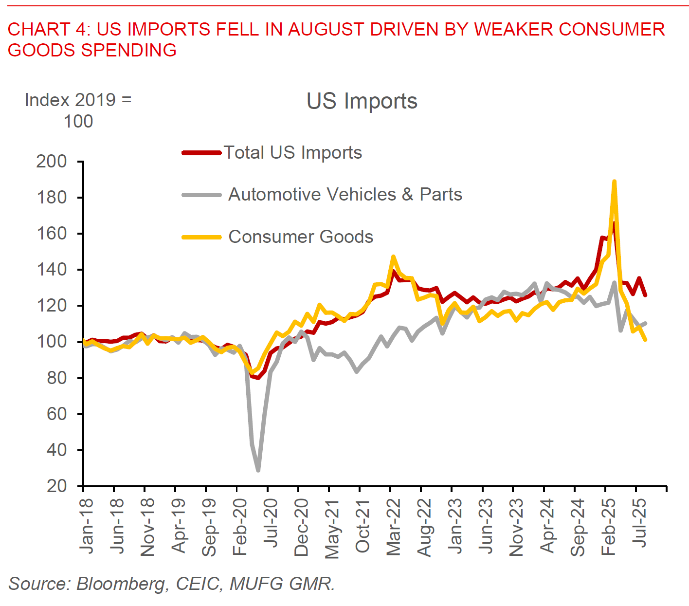 First, better than expected US macro data. 2nd quarter GDP in the US was revised up to 3.8% annualized, from 3.3% in the initial estimate, with personal consumption in particular estimated to rise 2.5% (from 1.6% in the preliminary estimate). Business investment rose by 7.3%, driven by higher spending on data centers, computer related equipment such as GPUs, coupled with stronger software spending. Of course, these numbers are backward-looking and also distorted by front-loading to some extent ahead of tariffs. The more timely indicators for August provide for a more mixed picture, with US durable goods orders ex transportation rising a stronger than expected 0.4%, while US goods imports fell 7% driven by softer consumer goods and also likely gold-related imports. Net-net, for Asia, the best lead indicators we track for Asia exports shows that exports are likely to slowdown modestly in the coming months, but interestingly are tentatively pointing towards a potential pickup in activity as we head into 2026.