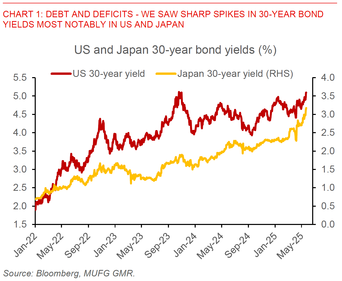 First, increasing concerns about debt and deficits, most prominently in the US but certainly not confined to it, and coming on the back of the recent Moody’s credit rating downgrade (see Till debt do us part). This was seen in the relatively poor US Treasury 20-year auction yesterday, resulting in US 30-year yields rising sharply by more than 12bps to 5.1%. Just as prominently Japan’s 30-year yields surged by 40bps to 3.14% from a weak auction, although whether that’s primarily due to fiscal concerns or a JGB supply-demand mismatch amidst BOJ’s tapering of bond purchases is unclear.