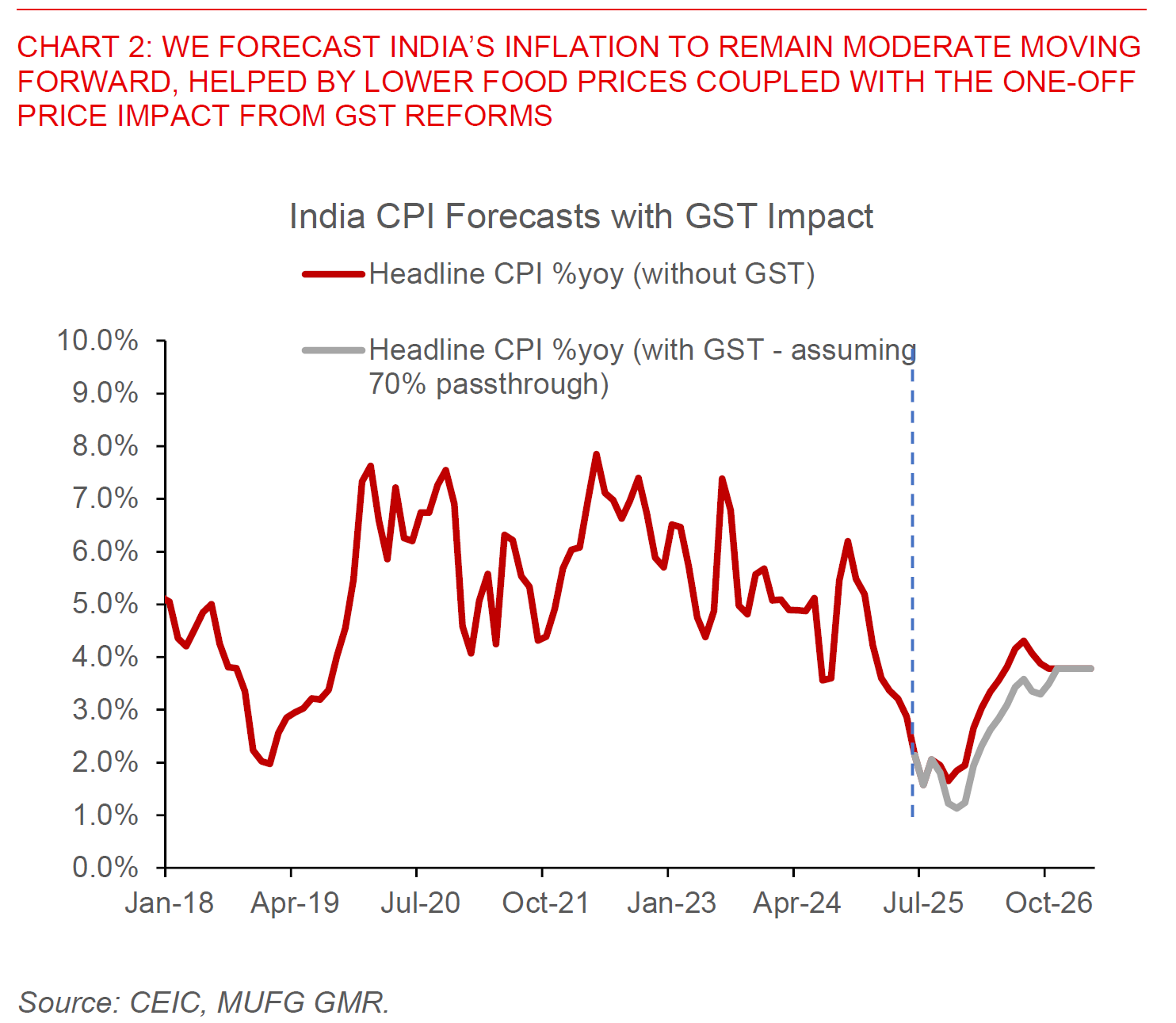 In India, the August CPI inflation numbers rose to 2.1% from 1.6% previously, and in line with consensus expectations. We estimate that month-on-month, this implied a 0.5% rise. The details suggest some increase in food prices partly contributed by volatile components such as tomato prices, perhaps exacerbated by recent floods. Nonetheless, measures of underlying inflation including the trimmed mean estimates suggest that outside of food and gold prices, price pressures in the economy remains soft. Moving forward, we expect the Reserve Bank of India to cut rates by another 50bps, with the inflation numbers overall coming in below the implied inflation forecasts by the central bank. The timing is a close call admittedly but we stick with our forecast for a cut in the October meeting, while we also expect RBI to push out credit related measures to support exporters hit by tariffs from the US, to help preserve working capital loan access and thereby also ensure indirect effects are contained. From an FX perspective, we are forecasting USD/INR to rise to 89.00 levels by 1Q2026, and reflecting our view that INR will continue to underperform Asian currencies and core G10 FX on the back of tariffs but with reforms such as in GST providing important offsets. Our forecasts implicitly imply that INR FX volatility will remain contained, and we also assume that the 50% tariffs are eventually lowered to 25%.