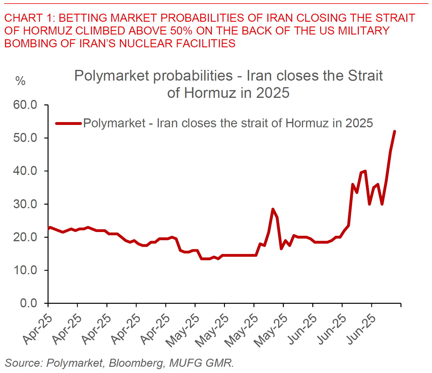 The next steps for markets will depend on how and to what extent Iran responds, and with that the extent of physical oil supply disruption. The left tail risk here is a full closure of the Strait of Hormuz – a key chokepoint where a fifth of all oil and gas production goes through. For what it’s worth, betting market probabilities on a Strait of Hormuz closure by Iran climbed above 50%, an event that if fulfilled will no doubt easily send oil prices spiralling above US$100/bbl. Nonetheless, it’s important to stress that there are many shades of grey in terms of scenarios, and to our minds, managed escalation is probably more likely, with Iran possibly responding through a variety of means but certainly falling short of meaningful disruption of global oil supplies.