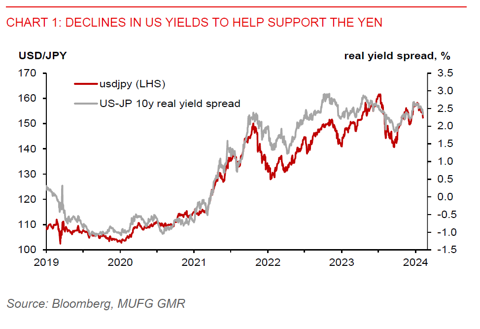 In Japan, a faster pace of labour cash earnings (+4.8%yoy in December vs. 3.0%yoy in November and Bloomberg consensus of 3.7%yoy) should help keep BoJ on its rate normalization path this year. This, along with a dip in Treasury yields, will help support some modest yen strength.