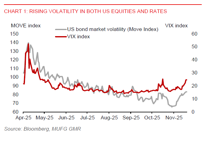 Upcoming data will be critical in shaping rate-cut expectations. The delayed September employment report due on November 20 could be a catalyst for a USD reversal if it delivers a huge negative surprise, while the PPI release on November 25 could provide clarity on inflation dynamics. Rates volatility has notably risen in November.