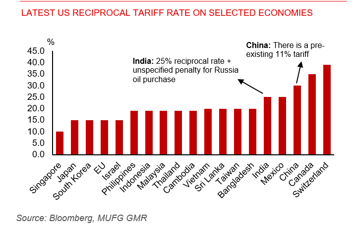 Donald Trump issued an executive order to “Further Modifying the Reciprocal Tariff Rates” on July 31st. Major industrialized economies through negotiation, including the European Union, Japan and South Korea, get 15% tariffs, while a punitive 39% tariff is set for Switzerland and tariffs for some Canadian goods are increased to 35%. Tariffs for Asia are in a wide range from 10% to 40%, major Asian economies face 15~30% tariffs. Tariffs and relative tariffs matter for competitiveness and will affect the dynamics of Asia’s supply chain shifting. The 25% tariffs on India products would give India no advantage over regional competitors while they face about 20% tariffs like Vietnam. Final tariffs on China are not confirmed yet, current tariffs on China products are 30%. Most of the tariffs will take effect after midnight on Aug. 7.