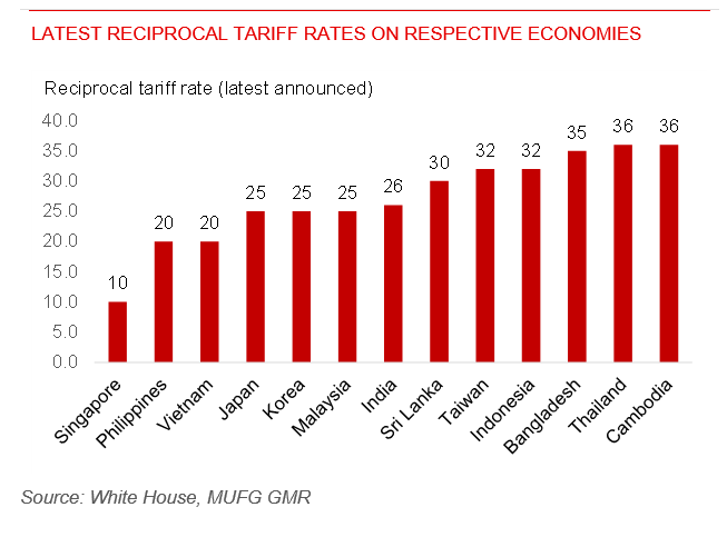 FX view: This week, as the US president’s 9 July deadline came and went, Trump announced a new set of reciprocal tariffs for more than 20 countries across the world, effective on 1 August. Particularly, a 50% tariff rate was set for Brazil, which wasn’t in the initial country list for reciprocal tariffs announced on 2 April. Brazil is a country that the US actually runs goods trade surplus with, not a goods trade deficit that Trump needs a tariff to rebalance. Trump also threatens to implement tariffs of up to 200% on foreign drugs and 50% on copper. Trump said also on Thursday that he plans to impose blanket tariffs of 15% or 20% on the remaining countries, “whether its 20% or 15%”. This new set of reciprocal tariffs came as a surprise to us. The tariffs are largely similar to the original reciprocal tariffs. An elevated 25% tariff rate was set for both South Korea and Japan. ASEAN economies in general face high tariffs as well, e.g. Indonesia (32%), Malaysia (25%), Thailand (36%), Philippines (20%) and etc.
