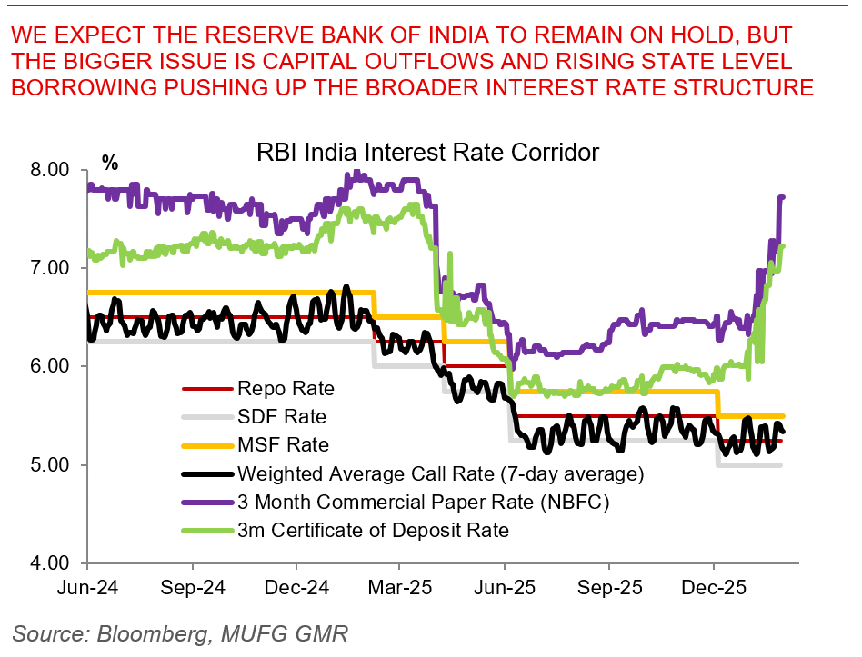 We expect the Reserve Bank of India to remain on hold, but the bigger issue is capital outflows and rising state level borrowing pushing up the broader interest rate structure