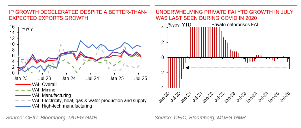 - Chinese economy displayed a broad-based weakness in July, despite an accelerated exports growth in the same period. Major indicators including retail sales, IP, FAI, and property sales/investment, all decelerated, consistent with recent release of July financial data (Link).