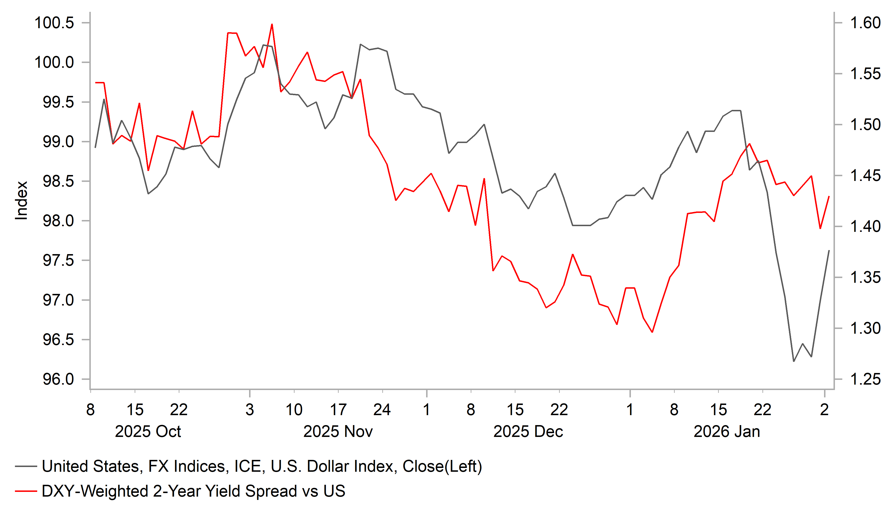 The US dollar has continued to rebound at the start of this week supported by President Trump’s decision to nominate former Fed Governor Kevin Warsh to the next Fed Chair. He is well respected by market participants and central bankers which is helping to dampen fears over threats to the Fed’s independence in setting monetary policy. The US dollar has benefitted from the scaling back of the US policy uncertainty risk premium that had been priced in at the start of this year. After diverging recently, the US dollar and yield spreads are becoming more aligned again. US yields and the US dollar were also lifted yesterday by the release of the much stronger than expected ISM manufacturing survey for January.