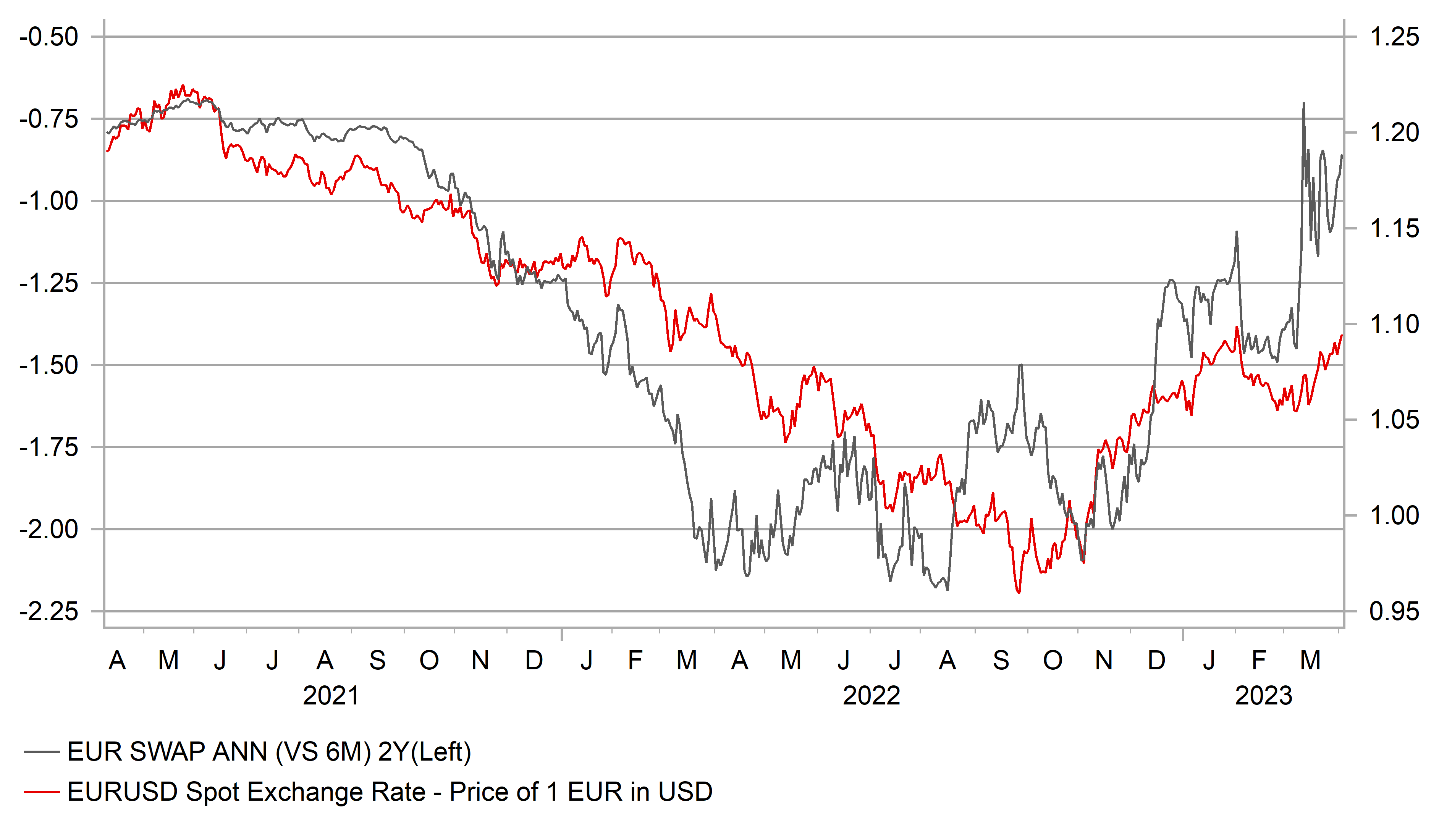 From an FX perspective we see the US dollar suffering most against the core G10 currencies. The Swiss franc, yen and euro remain three of the top four best performing G10 currencies (the pound is the other) and if yields in the US decline further that’s where we would expect to see the bigger moves. EUR/USD continues to lag where yields imply it should be trading – somewhere between 1.1000-1.1500. The 2-year EZ-US swap spread closed yesterday at -86bps, close to recent highs not seen since October 2021. If that level can be sustained over the short-term, we could very soon see EUR/USD back toward the middle of that 1.1000-1.1500 range.