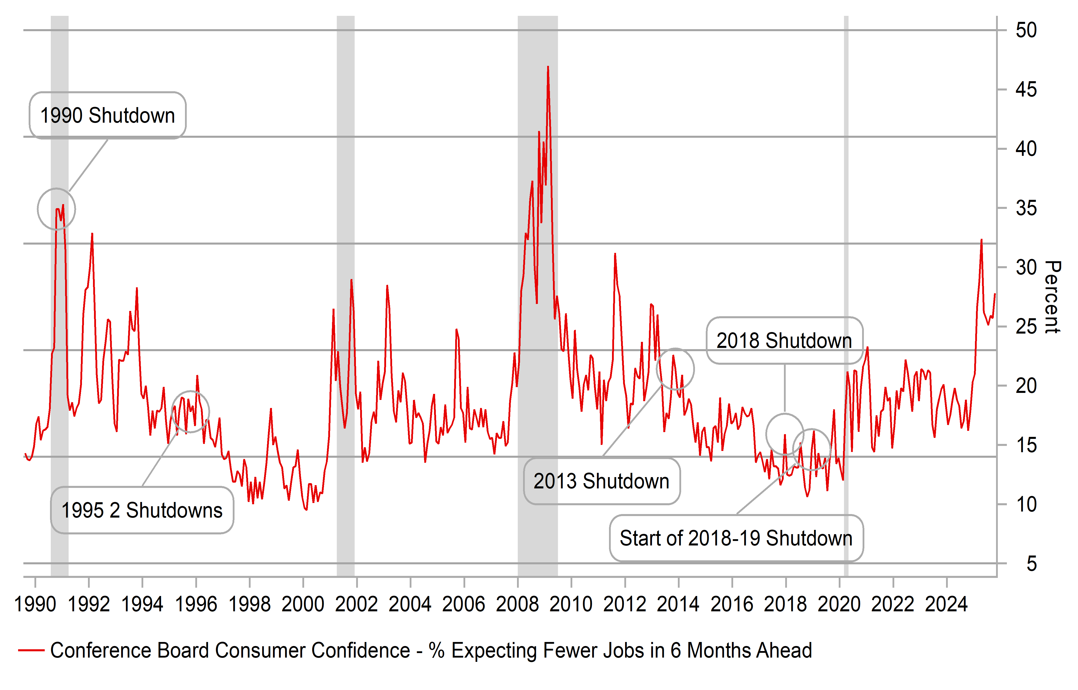 The US dollar advanced to levels above 100 in DXY yesterday and EUR/USD broke below the 1.1500-level although the technical breaches of these levels has not as yet triggered any increased momentum for buying. The government shutdown continues and today reached a record 36 days surpassing the previous longest from 2018-19. There have been some positive noises from Washington suggesting there could be a deal to re-open government. The deal would involve signing a short-term bill to re-open government with some of the 12 annual appropriations bills that are needed to fund government agencies. This would not be a complete resolution but would allow a re-opening. The Democrats in turn would get a vote on expiring ACA subsidies. A deal could be in place by the end of the week. That would then pave the way for the backlog of jobs data to be released. If the labour market has remained weak similar to the data of recent months, that could help prompt a turn in dollar buying momentum.