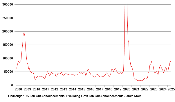 The much weaker ADP gain, for two consecutive months, does raise the bar of a weaker NFP gain today – month-to-month ADP changes is not a reliable guide for NFP but two consecutive weaker prints does increase the prospect of a weaker NFP. The last time ADP employment gains were this weak over two months, the NFP gain slowed sharply from 306k to 85k (March 2023). The initial claims data is also signalling slowdown. The 247k increase in initial claims was the largest since October last year. Continuing claims fell modestly from last week’s level but averaged over the two weeks, continuing claims are at the highest since November 2021. The pick-up in continuing claims is an indication that those losing their jobs are finding it more difficult to get new employment quickly, highlighting weakening labour market conditions. The Challenger Job Cut Announcements was also released yesterday and when government job cut announcements are excluded (DOGE-related volatility) the private sector job cuts are elevated at levels around the highs not seen since covid.