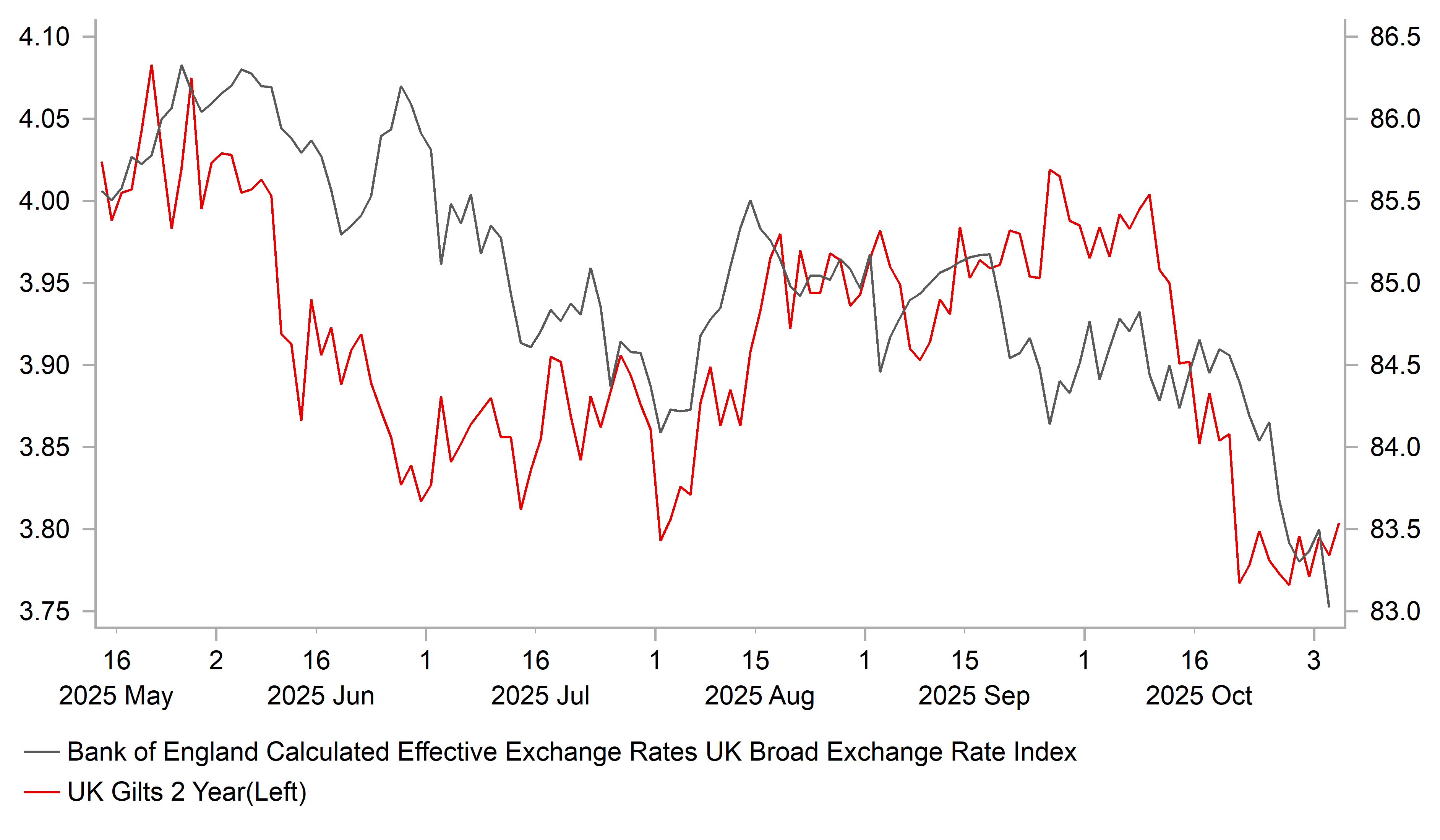 The main focus today will be the BoE’s latest policy update. The pound has weakened ahead of the policy update as market participants have moved to price back in more rate cuts following the release of the softer UK CPI report for September, further evidence of soft UK labour market conditions including slowing wage growth, and building expectations for the UK government to set out plans for significant tightening measures totalling around GBP20-40 billion in the upcoming Autumn Statement. The UK rate market is currently pricing in around 6bps of cuts for today’s MPC meeting and 17bps by the December MPC meeting. It fits with our view for a dovish hold today that sets up a rate cut at the next MPC meeting in December.