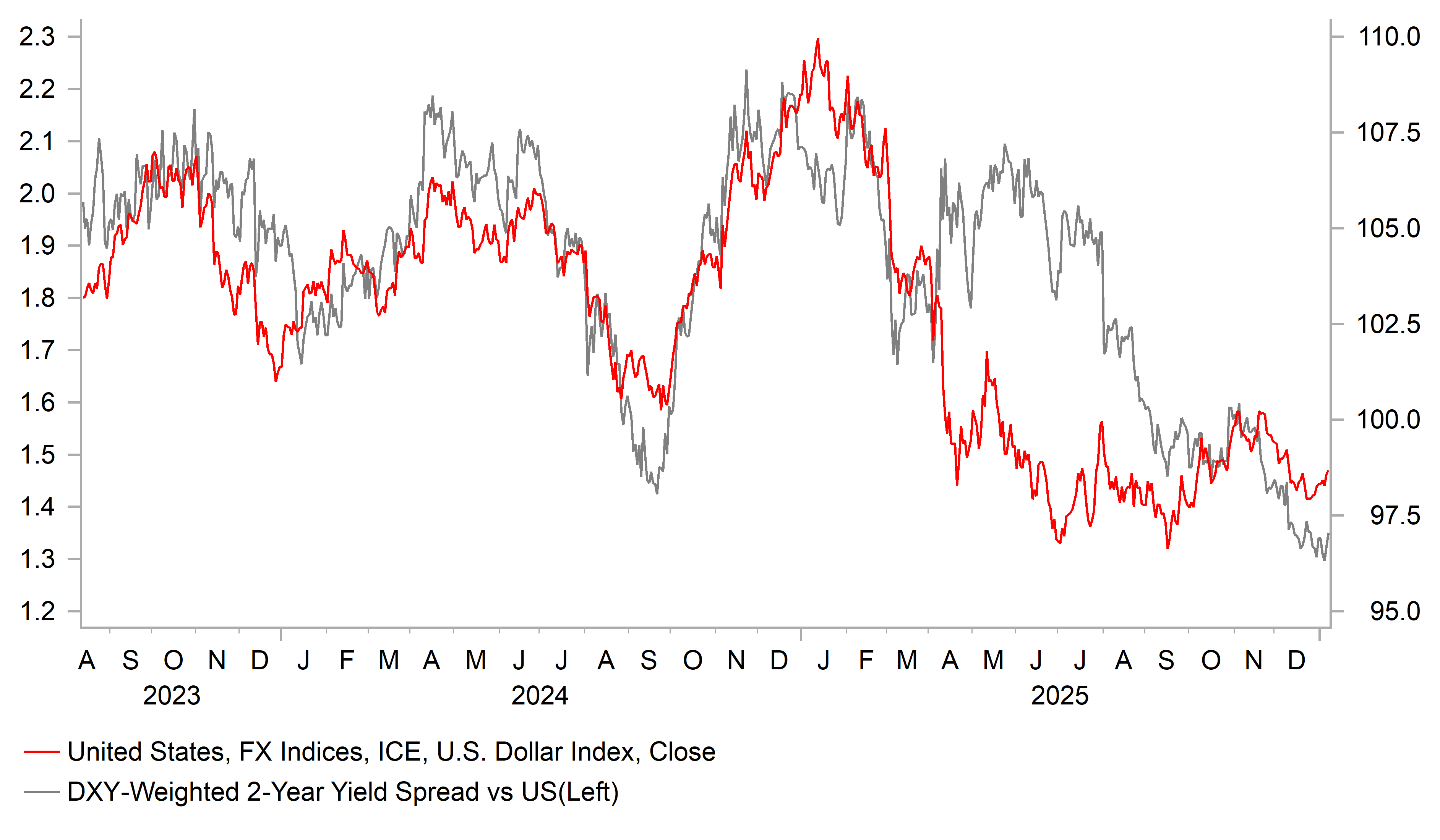 However, the positive signal for the US labour market was partially offset by evidence of continued weakness provided by the releases of the latest ADP and JOLTS surveys. The ADP survey estimated that private employment growth increased by only 41k in December. Similarly, the latest JOLTS survey revealed that job openings dropped to the lowest level since September 2024. Overall, the data continues to indicate that labour demand remains weak, but there has been no sharp increase in job layoffs which have remained stable. Based on recent comments from Fed officials, the US labour market would have to deteriorate further to bring forward plans for further rate cuts this year which was not supported by yesterday’s data releases. The Fed has clearly signalled it plans to leave rates on hold this month after three consecutive rate cuts to allow more time to assess the health of the US economy. There are currently only around 4bps of Fed cuts priced in for this month. Tomorrow’s NFP report would have to be much weaker than expected to prompt a fourth consecutive rate cut and trigger a sharp reversal of recent US dollar gains. Our updated FX forecasts released in yesterday’s Annual Outlook report revealed that the we expect the US dollar to hold up better at the start of this year before weakening further as the year progresses. Please see the report for more details (click here).