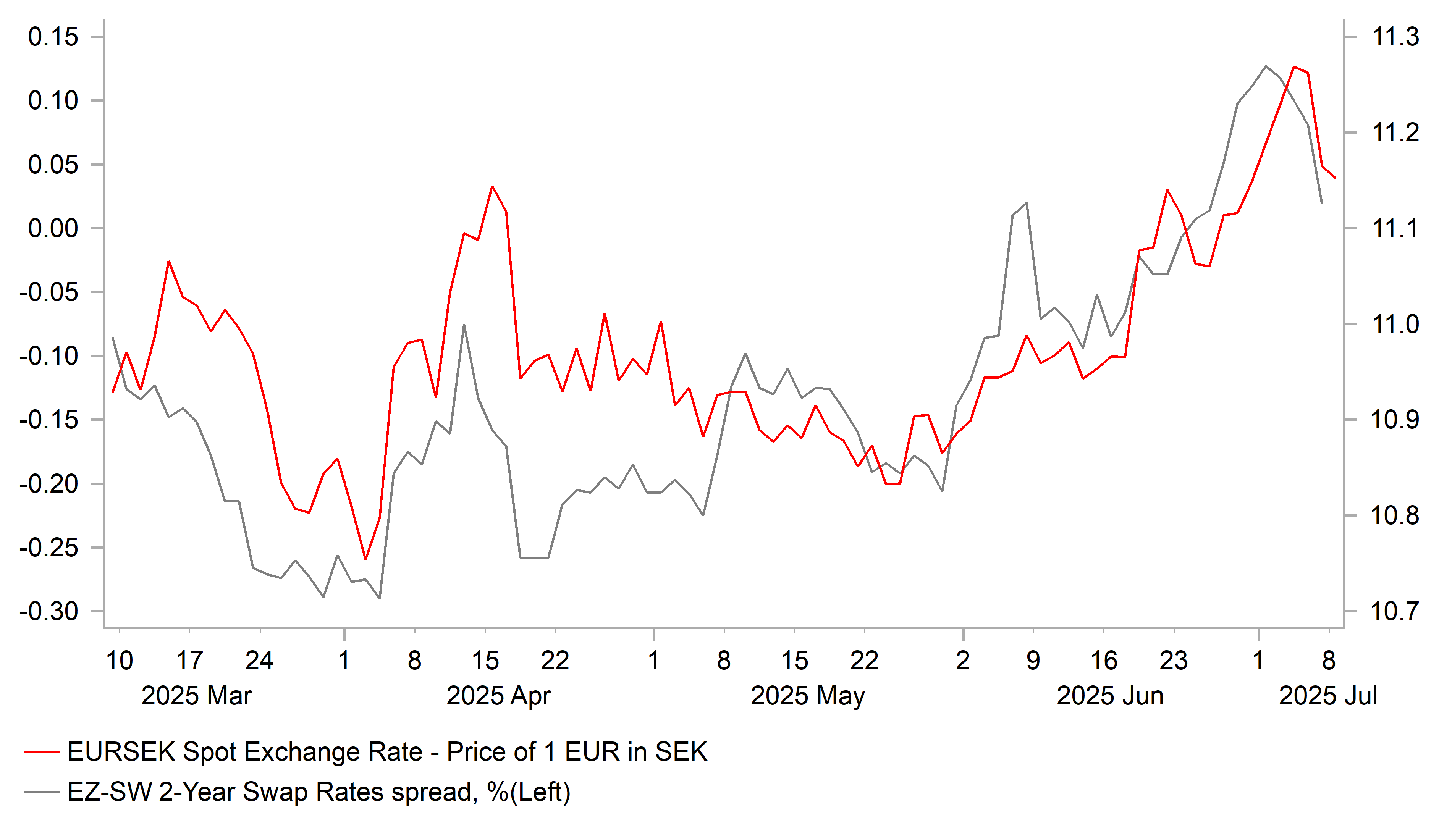 Elsewhere, there was a big upside inflation surprise yesterday in Sweden which has killed expectations for another rut cut from the Riksbank as soon as next month. The release of the latest CPI report from Sweden revealed that core inflation (CPIF excluding energy) jumped to 3.3% in June up from 2.5% in May. The Riksbank will now have to wait for confirmation as to whether the pick-up will prove temporary before considering cutting rates again to support the weak economic recovery in Sweden. The hawkish repricing of Riksbank expectations has helped to prevent EUR/SEK from breaking above resistance from the 200-day moving average at just above the 11.200-level. Please see our latest FX Weekly (click here) for more details on Scandi FX.