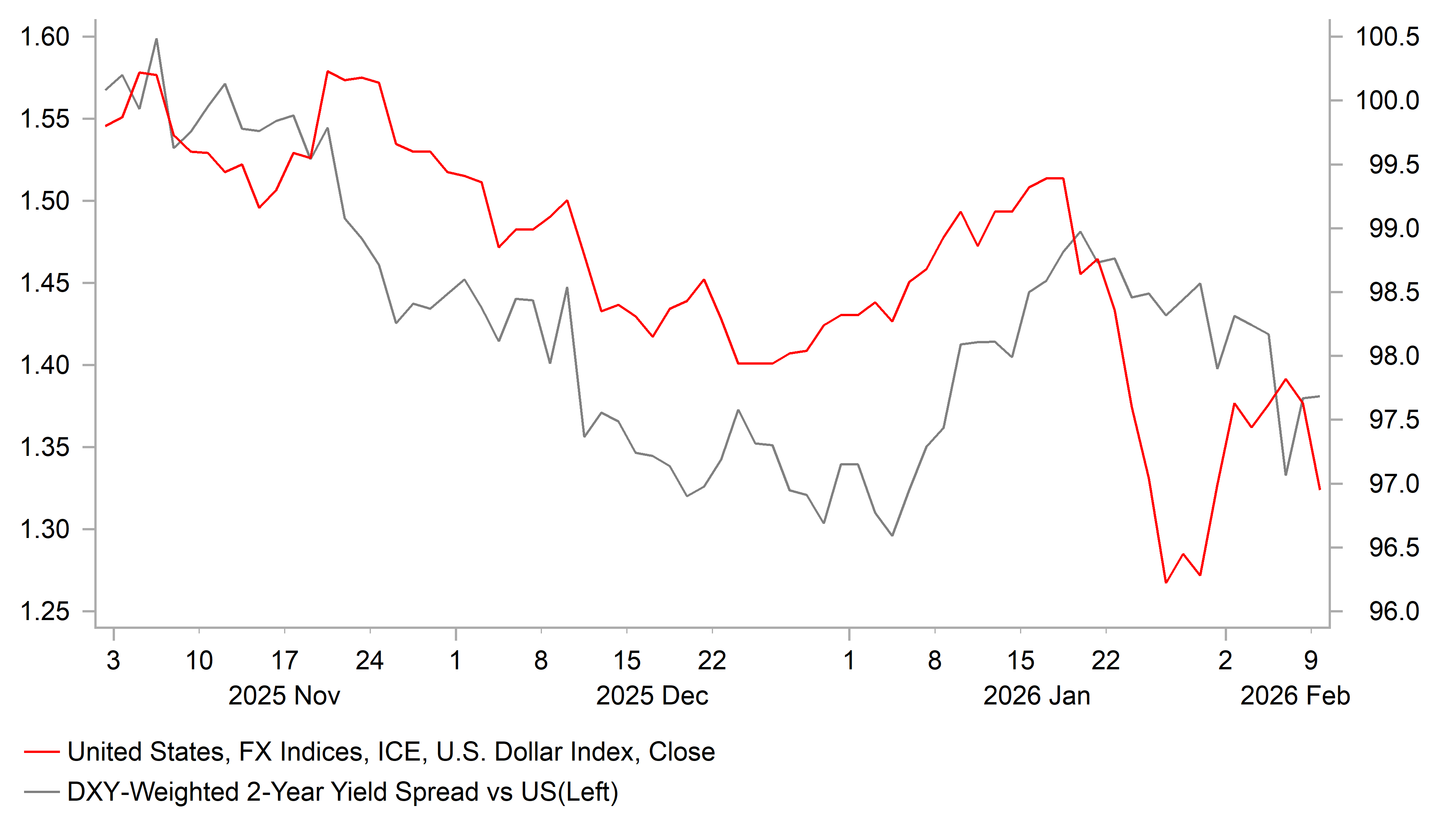The US dollar has continued to trade at weaker levels overnight after correcting lower at the start of this week.  After hitting a high of 97.986 at the end of last week, the dollar index has fallen back below the 97.000-level. The US dollar sell-off yesterday was reinforced by comments from National Economic Council Director Kevin Hassett who stated that “I think we should expect slightly smaller job numbers that are consistent with high GDP growth right now”. He cautioned that “one shouldn’t panic if you see a sequence of numbers that are lower than you’re used to, because, again, population growth is going down and productivity growth is skyrocketing”.  As a result, he believes that the so-called breakeven rate is “quite a bit lower” than it was under former President Biden. The breakeven rate is the number of jobs required each month to keep the unemployment rate steady. The comments have understandably dampened expectations for job growth ahead of the delayed release tomorrow of the nonfarm payrolls report for January. The current Bloomberg consensus forecast is looking for private sector employment growth to pick-up to 70k in January compared to compared to an average of 43k in the second half of last year. Market concerns over persistently weak labour demand were also reinforced last week by the sharp drop in job openings which has cast some doubt on the Fed’s judgement at the latest FOMC meeting that downside risks to the labour market have eased. If  labour demand continues to remain weak it will keep alive expectations for the Fed to lower rates further this year. The US rate market has been moving to price in more Fed cuts, and is currently pricing in around 58bps of easing by the end of next year. However the timing of the next rate cut is not expected until the new Fed chair is likely to be in place at the June FOMC meeting. We outlined our thoughts in more detail on the potential impact of former Fed Governor Kevin Warsh taking over as Fed chair in our latest FX Weekly (click here).