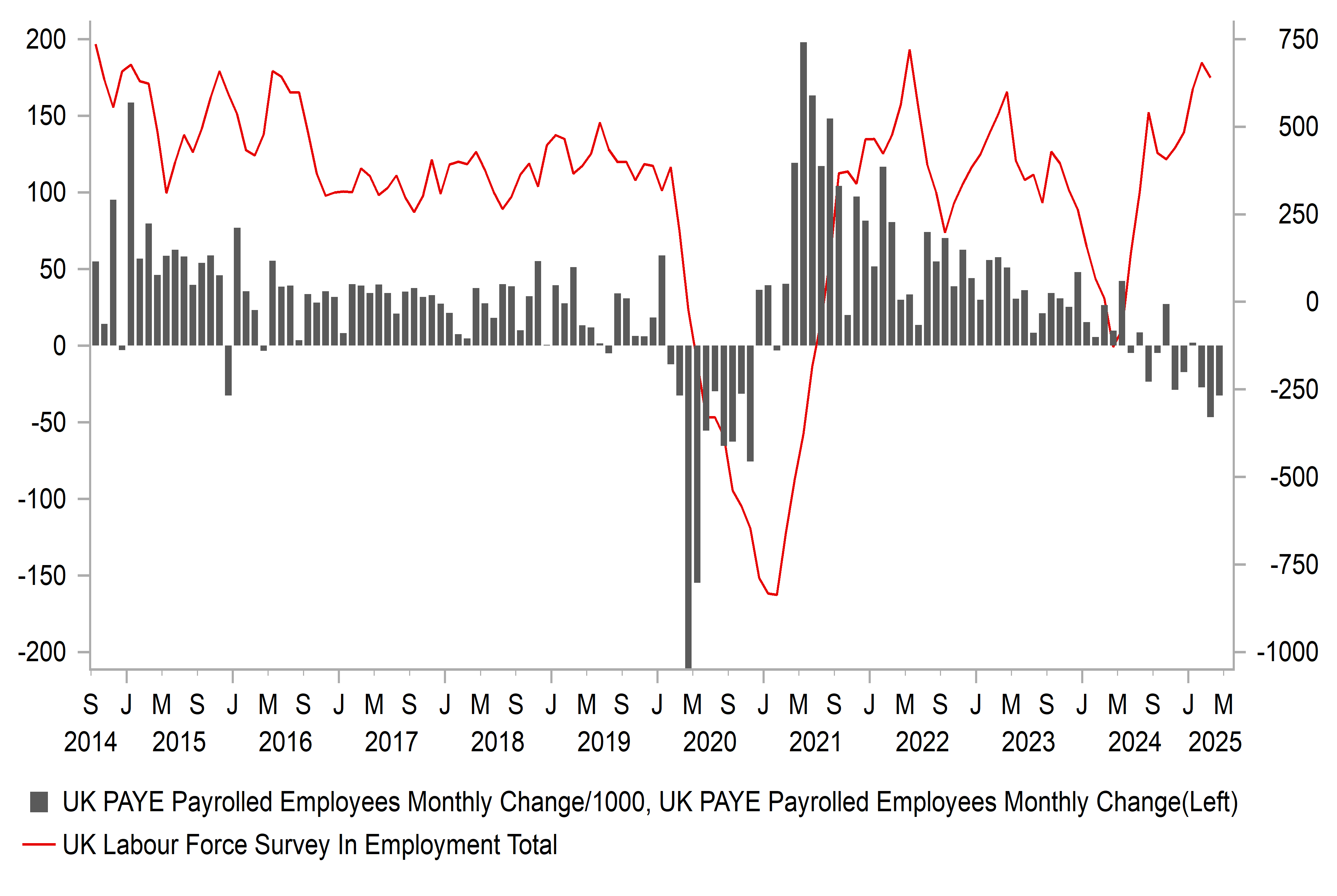 This morning, the ONS released the monthly labour market data and overall the data is on the softer side but a little mixed in terms of wage data. The headline wage growth rate on a 3mth YoY basis was stronger than expected but excluding bonuses was a little weaker. The PAYE jobs data continues to show a notable slowdown and a clear weakening trend. The employment change m/m was -33k in April after a 47k drop (revised from -78k) and the April drop was the fifth in the last six months and seventh in the last nine months. But the PAYE wage data was stronger than expected. It’s clear from this data that the UK labour market is weakening. Overall the labour market data looks consistent to us with the BoE easing policy but in a careful and gradual manner.