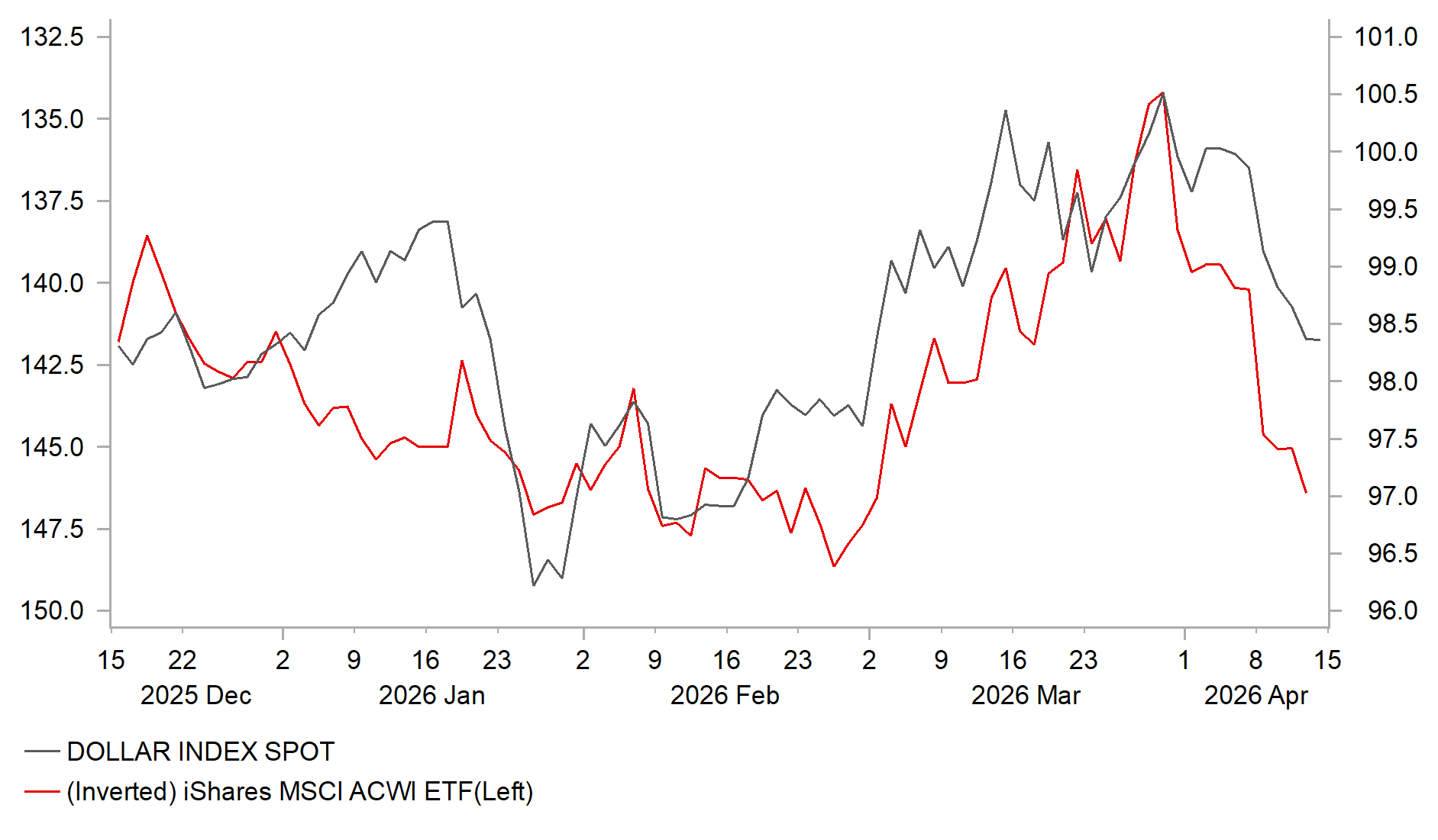In the foreign exchange market the best performing G10 currencies this month on the back of building investor optimism that the Middle East conflict will continue to deescalate have been the Scandi currencies of the Norwegian krone and Swedish krona closely followed by the commodity currencies of the New Zealand and Australian dollars while the US dollar and yen have both underperformed. The failure of the US dollar to strengthen further in response to the energy price shock is clearly a bearish development which is increasing downside risks to our updated forecasts (click here). We looked at potential reasons why the US dollar has underperformed relative to our expectations in our latest FX Weekly report (click here).