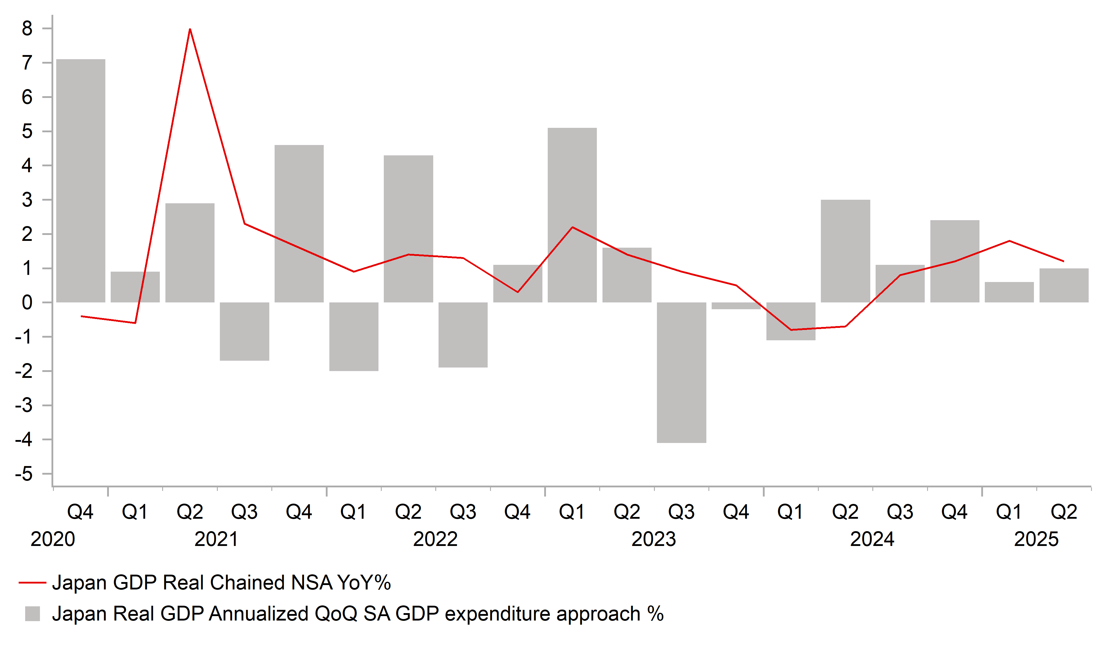 The jump in US yields triggered by the stronger US PPI report helped to lift USD/JPY to high yesterday of 147.96 up from an intra-day low of 146.21. The pair has since fallen back towards the 147.00-level overnight as the yen has strengthened across the board following the release of the latest GDP report from Japan. The report revealed that Japan’s economy picked up more than expected in Q2 expanding by an annualized rate of 1.0%. In addition, the economic contraction in Q1 of -0.2% was revised away as growth was revised up to 0.6%. As a result, Japan’s economy has now recorded positive growth for five consecutive quarters. The expenditure breakdown revealed that private final consumption increased for the second consecutive quarter by 0.2% in Q2. Capital investment picked up to 1.3% in Q2 from 1.0% in Q1. Despite tariff disruption, exports (2.0%) increased more strongly than imports (0.6%) resulting in net trade contributing positively (+0.3ppts) to growth in Q2. Export growth may partly reflect some front-loading of demand prior to the US-Japan trade deal but will provide reassurance that the negative impact from trade disruption is less than feared.