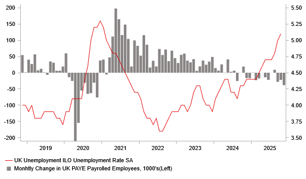 The release today of the latest UK labour market report provided further evidence of loosening labour market conditions. Payrolled employees fell by -38k in November. It was the largest monthly decline this year and takes the year to date drop to almost -154k. Loosening labour market conditions were also highlighted by the ongoing rise in the unemployment rate to a new cyclical high of 5.1%. It has risen by 1.0 percentage point in just over a year. Loosening labour market conditions and softening inflation are helping to slow wage growth. Private sector wage growth excluding the more volatile bonus component slowed to 3.9% 3M/YoY in October down from 4.2% in September, although it was a little higher than the consensus forecast. It has been trending lower since the end of last year when it was at 6.2% in December 2024.