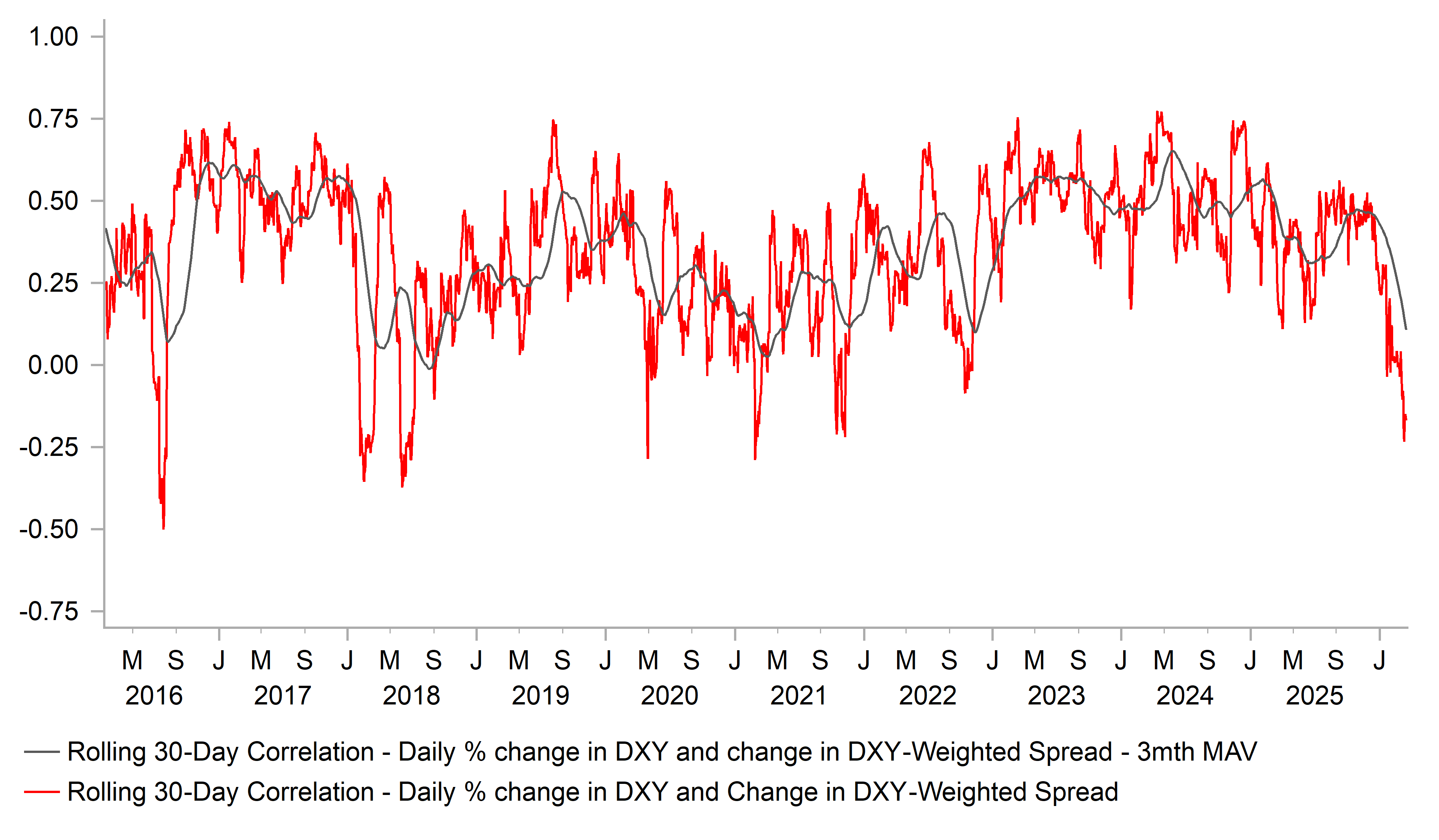 The US dollar is around 2% stronger since the conflict began with EUR/USD down 2.3% with about 35bps of rate cuts removed from market pricing since the conflict began. We would be surprised to see any big rates or FX moves this evening given the likelihood of a balanced communication with no strong signals. As can be seen above, FX is currently not being driven by relative rate expectations with the above correlation at its weakest since the covid period in 2020-21. A similar chart indicating the DXY / crude oil correlation has seen a sharp strengthening of the US dollar / crude oil correlation. So with all eyes on the newsflow from the Middle East and energy prices, we do not expect much in the way of rates and FX volatility following the FOMC meeting.