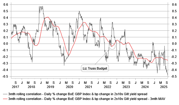ROLLING CORRELATION OF DAILY % GBP TWI PERFORMANCE & CHANGE IN 2S10S GILT YIELD SPREAD – STEEPER CURVE MEANS WEAKER GBP